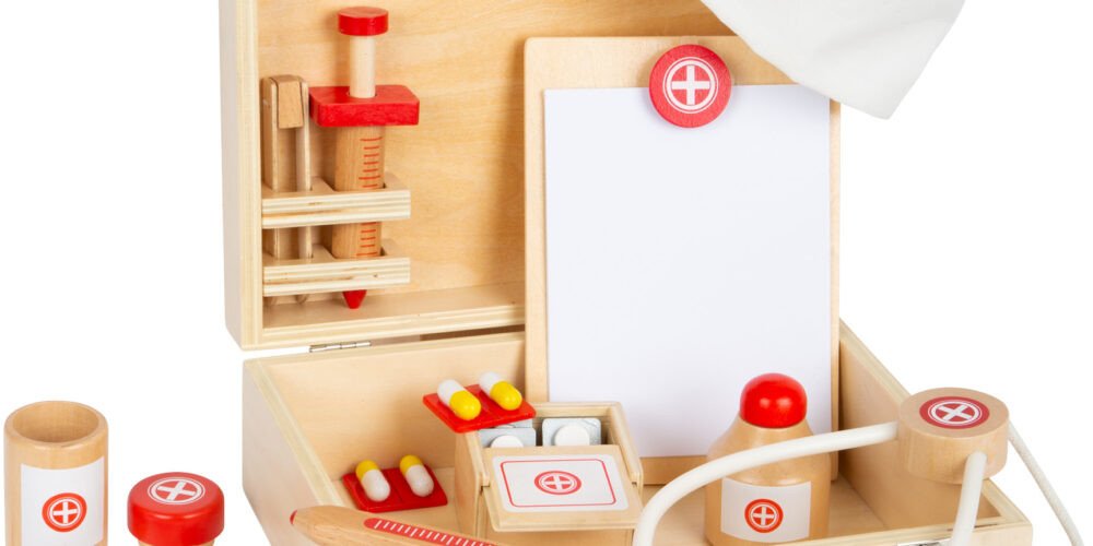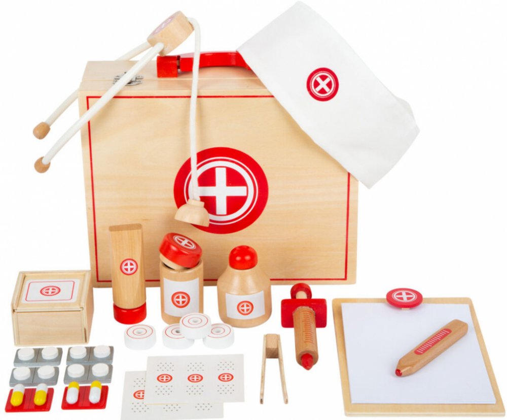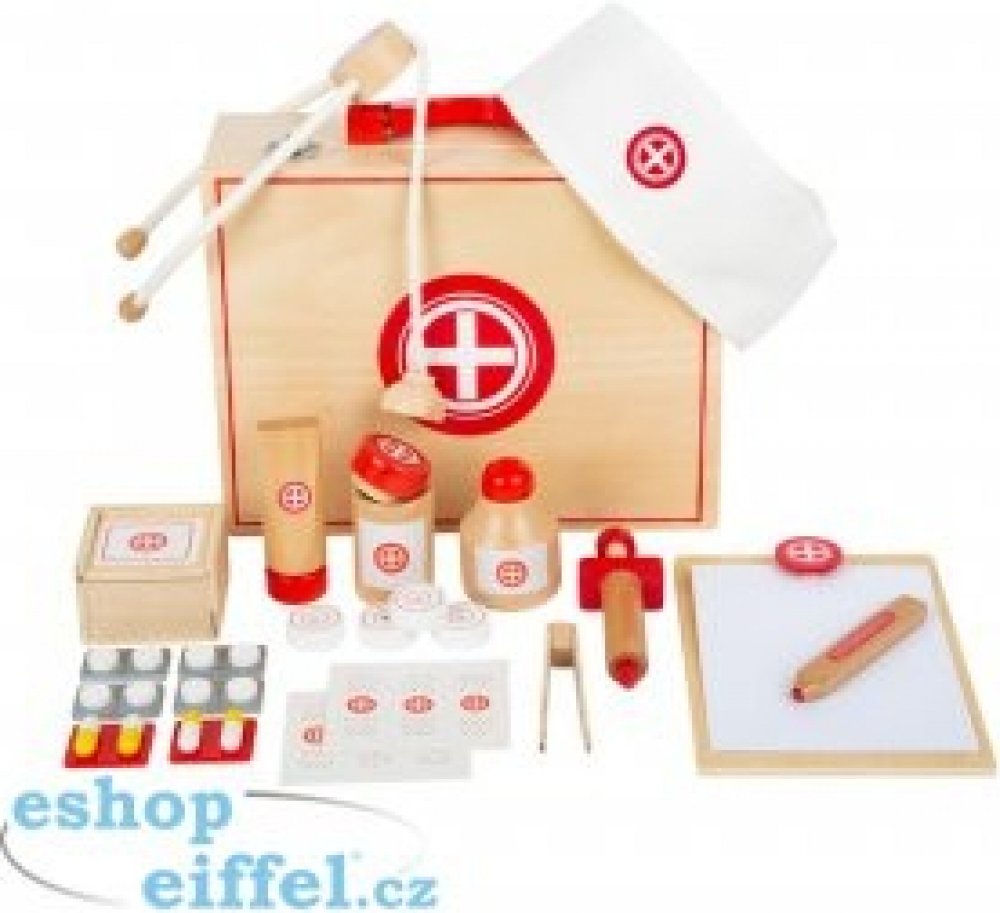 Lékaři už jsou na cestě! Mladí doktoři a doktorky se mohou s tímto dětským setem perfektně vybavit na cestu k pacientům. Kufřík obsahuje všechny důležité zdravotnické pomůcky, také vypadá pěkně – je plně dřevěný s klasickou bílo-červenou barvou. V kufříku najdete balení mastičky, láhev s tinkturou, stetoskop, injekční stříkačku, náplasti, tabletky, pinzetu, teploměr, papírový blok. Vše je samozřej...