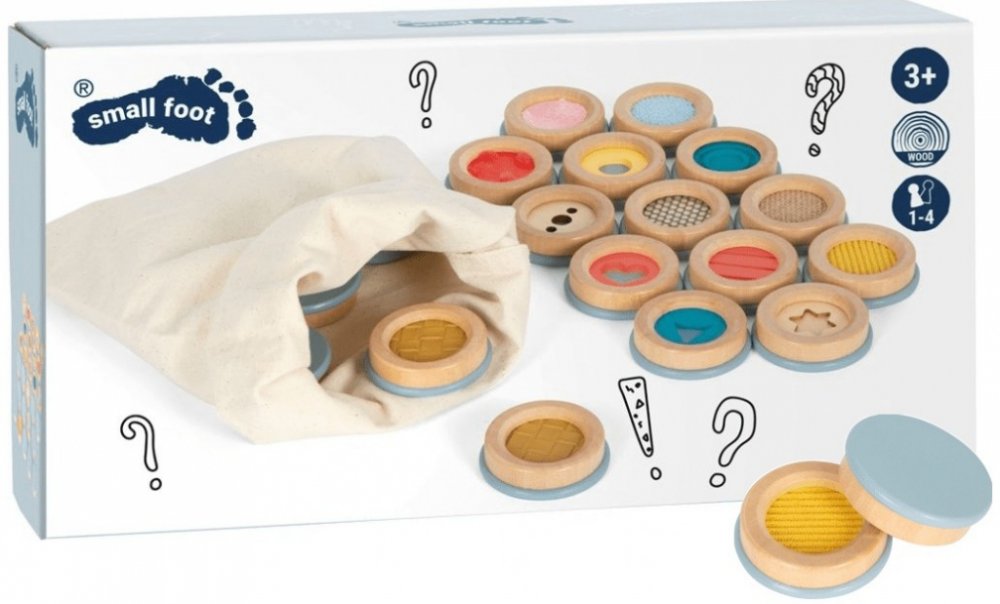 Po dokončení hry se všechny herní prvky dají uložit do bavlněného pytlíku. Tato smyslová hra nejen podporuje rozvoj hmatu a paměti, ale také slibuje spoustu rozmanité herní zábavy díky různým variantám hry. Lze ji hrát také jako hru vizuální paměti, protože různé povrchy mají také různý vzhled. Jedním ze způsobů, jak upravit úroveň obtížnosti v závislosti na věku a schopnostech dětí, je, zda může herní prvek zůstat převrácený nebo musí být znovu otočen zpět. Je to všestranná společenská hra orientovaná na paměť, která trénuje hmat a zároveň je velice zábavná.
