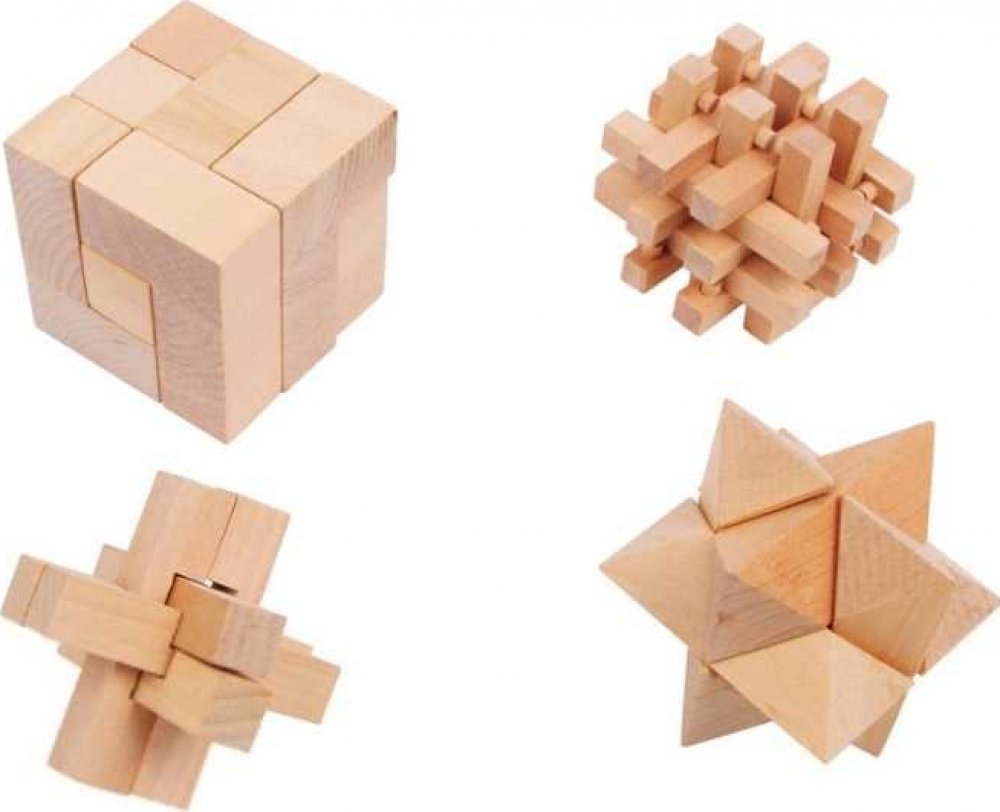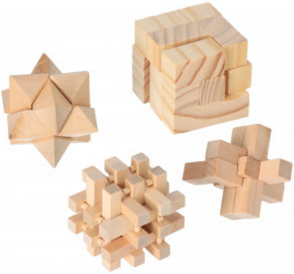 Zapeklitá situace! Tyto 4 dřevěné hlavolamy pro mladé i starší ruce opravdu zaměstnají mozek. Různé tvary z přírodního dřeva rozložte a poté se je snažte dát zpět dohromady. Musíte být zruční a soustředění. Kdo postaví hlavolam nejrychleji?