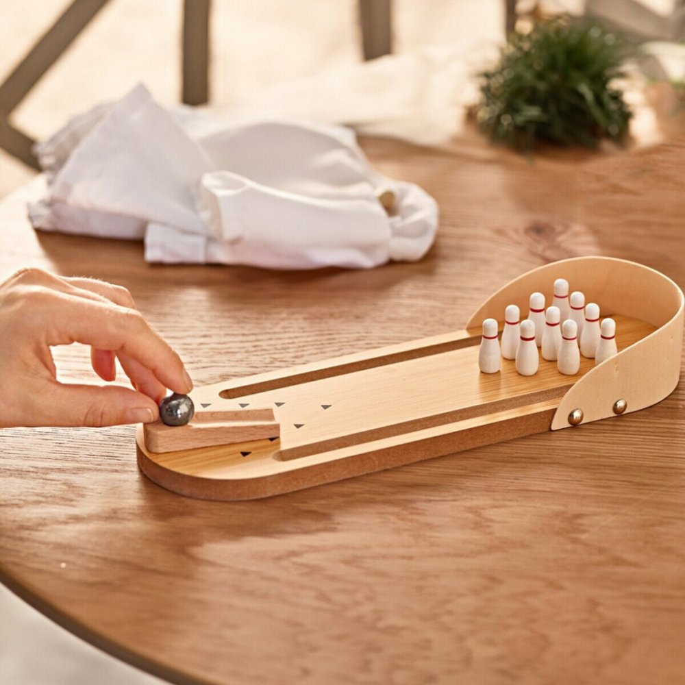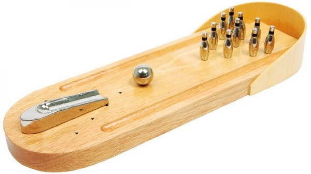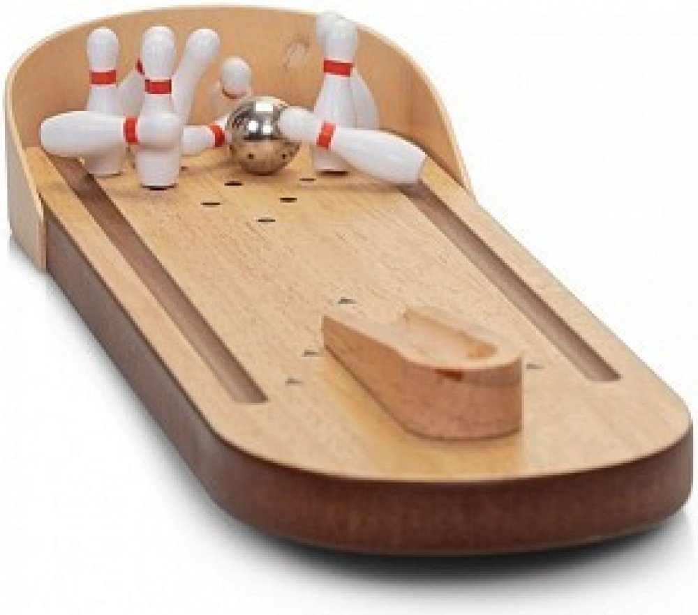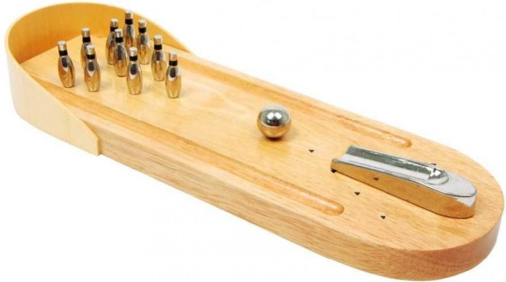 Kovové kuželky se postaví na nalakovanou dřevěnou desku, kulička se položí do drážky a pustí se, kdo docílí nejvíce "strikes"?