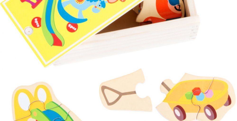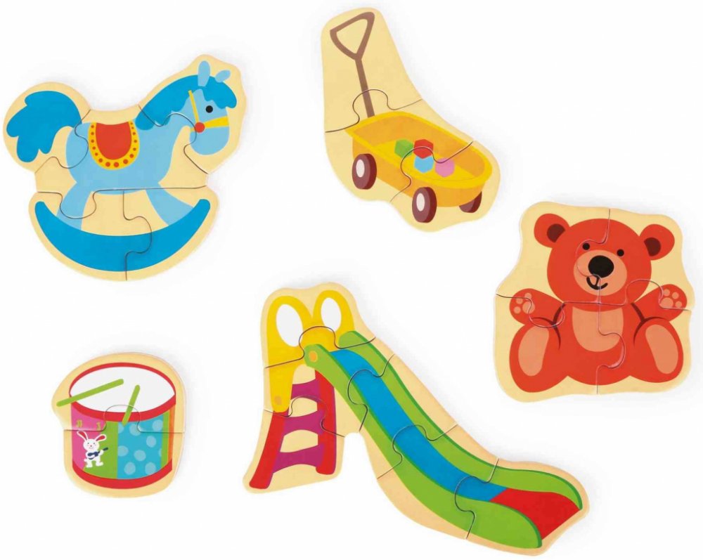Barevná zábava i pro nejmenší! Puzzle obsahuje pět různých motivů s oblíbenými věcmi dětí – houpací kůň, plyšový medvěd, vozíček, klouzačka a buben jsou připraveny k složení. Puzzle se skládají z dvou až šesti dílků. Dílky jsou vyrobeny z robustního dřeva, jsou krásně malované a jejich velikost je tak akorát pro dětské ruce. Puzzle trénuje jemnou motoriku a můžete jej jednoduše přenášet díky dřevěné krabici.