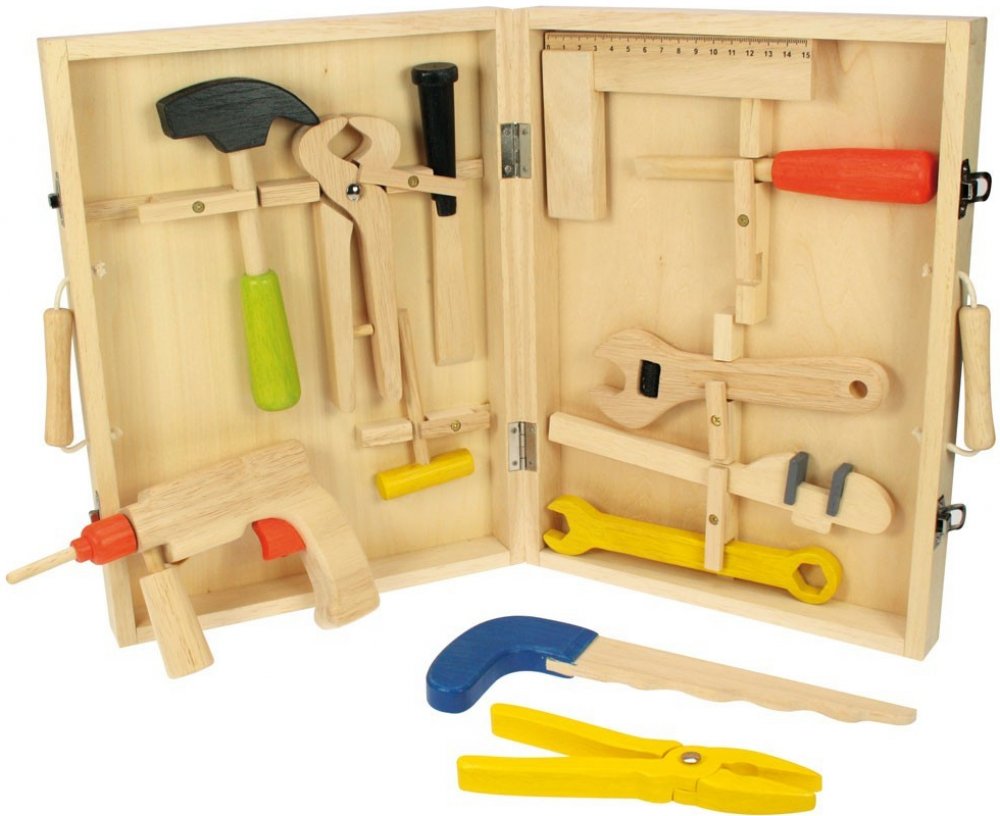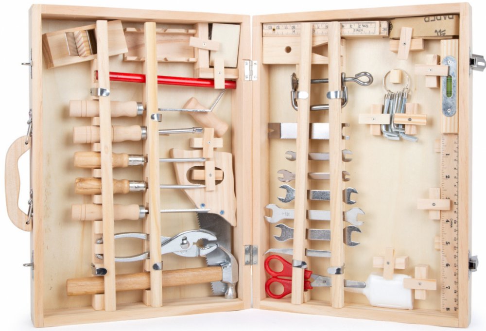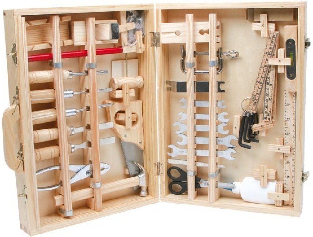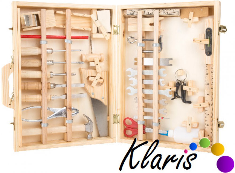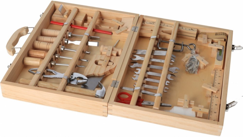 Skvělý pracovní kufr: Dřevěný kufr se 48 díly pro malé domácí pracovníky! Tady najdeš mnohé nářadí, co potřebuješ na opravy - od pravítka po tužku, šroubováky, klíč, imbusový klíč až po kladívka, pilku a dláto. Každý výrobek v kufru má své místo a všechny díly jsou pevně přichyceni, tak při přenosu budou pěkně držet na svých místech. Pro malé pracovníky s kovem a dřevem je tento kufr nutností!