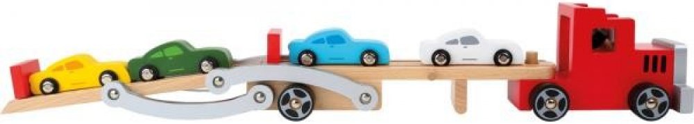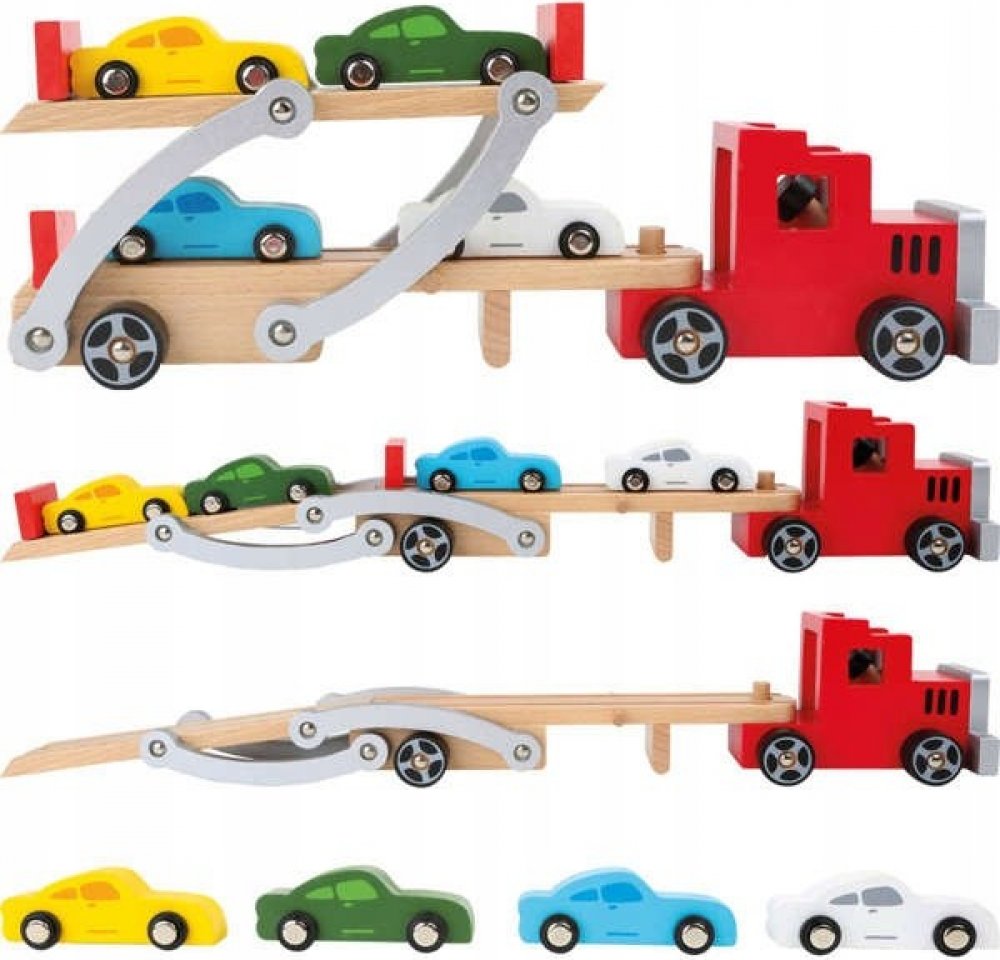 Pozor, zde se nakládají břemena! Chcete-li převézt nové modely aut z místa A na místo B, je potřeba tohoto stabilního přepravního vozu. Naložit lze čtyři auta. Nakloněním nákladní plochy můžou dřevěné auta pohodlně najet na Transporter nebo z něj sjet. Zvednutá plocha opatřena závorou zabrání nechtěnému couvnutí aut. Přívěs se připojí k tahači a už se jede!