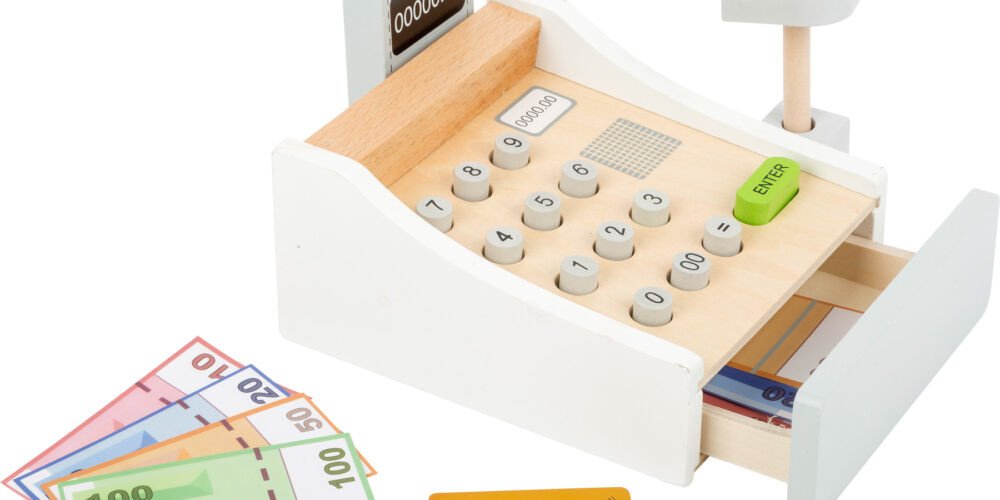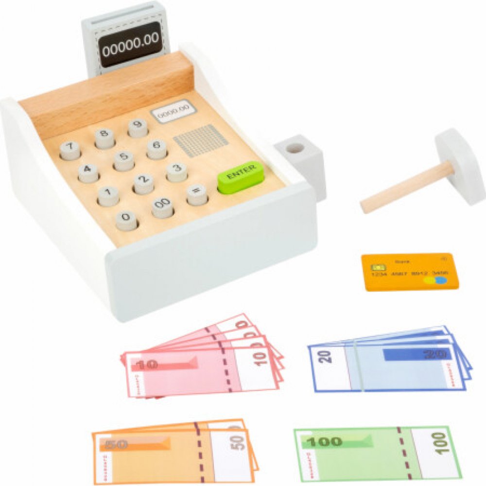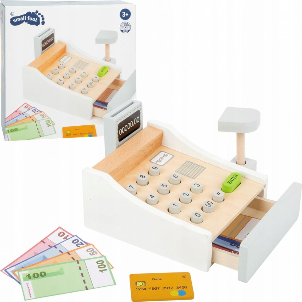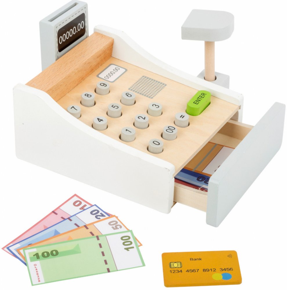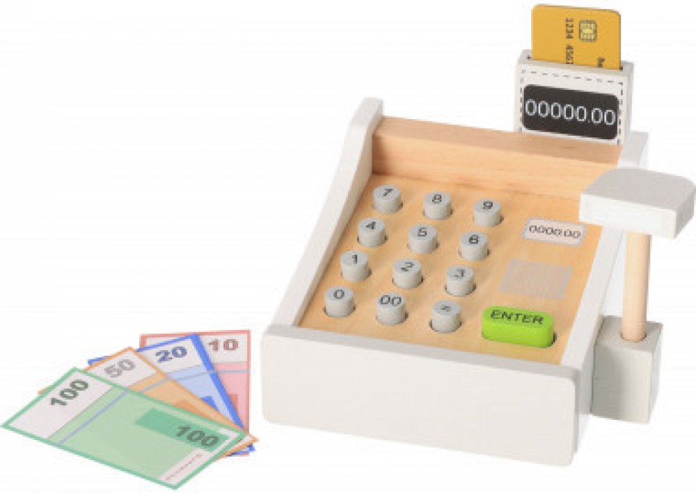 Peníze se jen sypou! Tato krásná dřevěná pokladna patří do každé dobře organizované dětské prodejny. Hraní s touto hračkou pomáhá dětem pochopit ceny zboží a manipulaci s penězi. Součásti jsou bankovky na hraní a dřevěné kreditní karty, které se pohodlně vejdou do spodní zásuvky. Cena zakoupeného zboží může být zadána na klávesnici. Kdo je další na řadě?