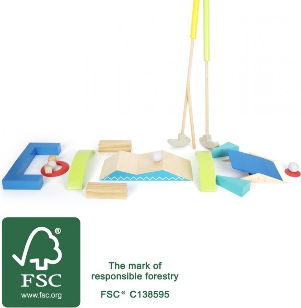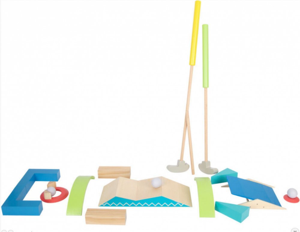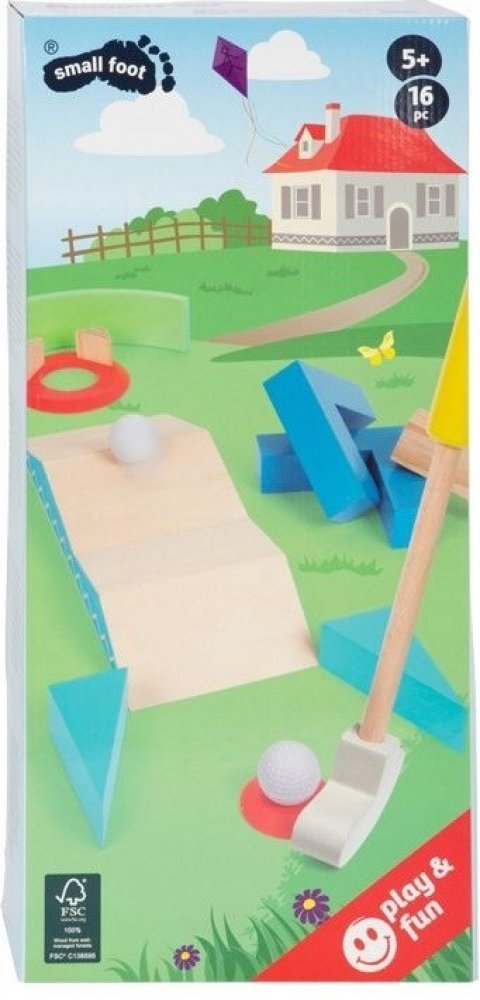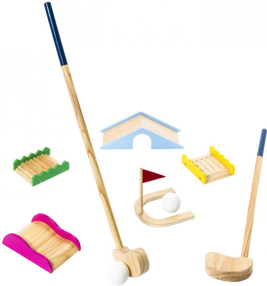 Set na minigolf vyroben z odolného a silného dřeva. V balení najdete golfové hole v 3 různých délkách, pro golfisty a golfistky všech velikostí. Míčky jsou bezpečně měkké. Zabaleno v praktickém vaku k jednoduchému uskladnění i přenosu. V balení vlny, houpačka, tunel a další překážky. Rozložení dráhy a úroveň obtížnosti lze nastavit pro různé věkové kategorie. Trénuje zručnost a soustředění. Klasic...