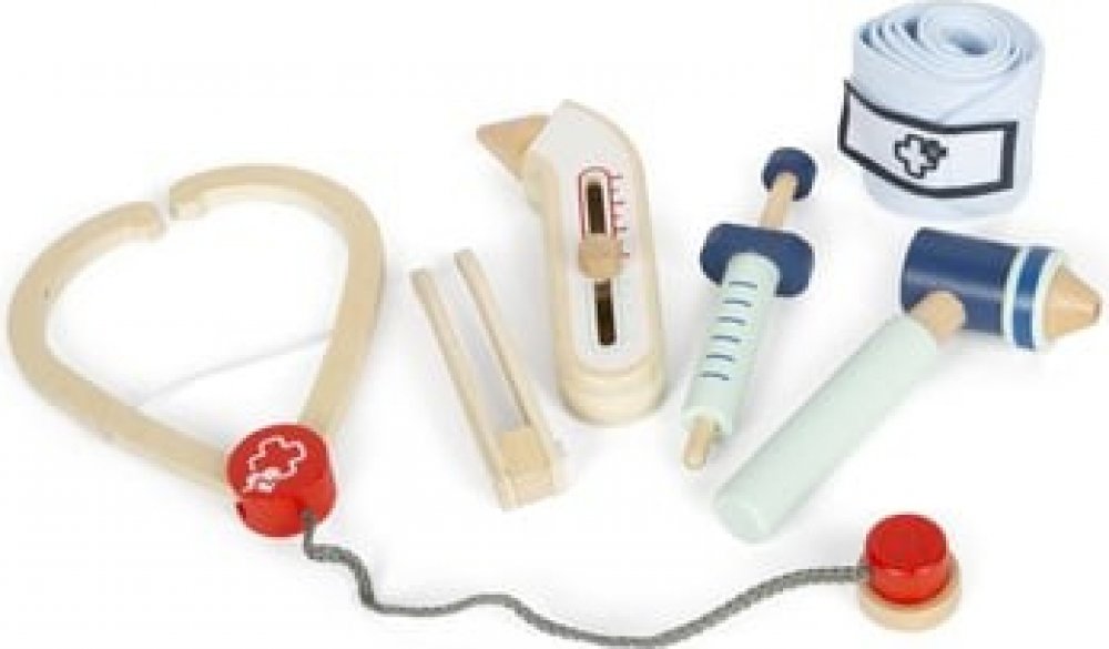 Ponořte se do vzrušujícího světa opravdové medicíny! Tato 6dílná sada má vše, co mladí lékaři potřebují. S lékařskou sadou jednoduše vyléčíte všechny nemocné plyšáky i panenky! Sada je vyrobena z robustního dřeva. Injekční stříkačka, teploměr, otoskop, pinzeta, obvaz a stetoskop nesmí chybět v žádné domácnosti malých lékařů. Tato herní sada aktivním způsobem inspiruje představivost a kreativitu ml...