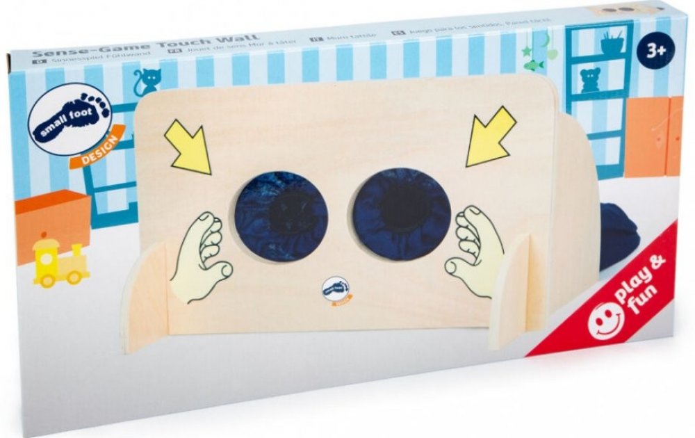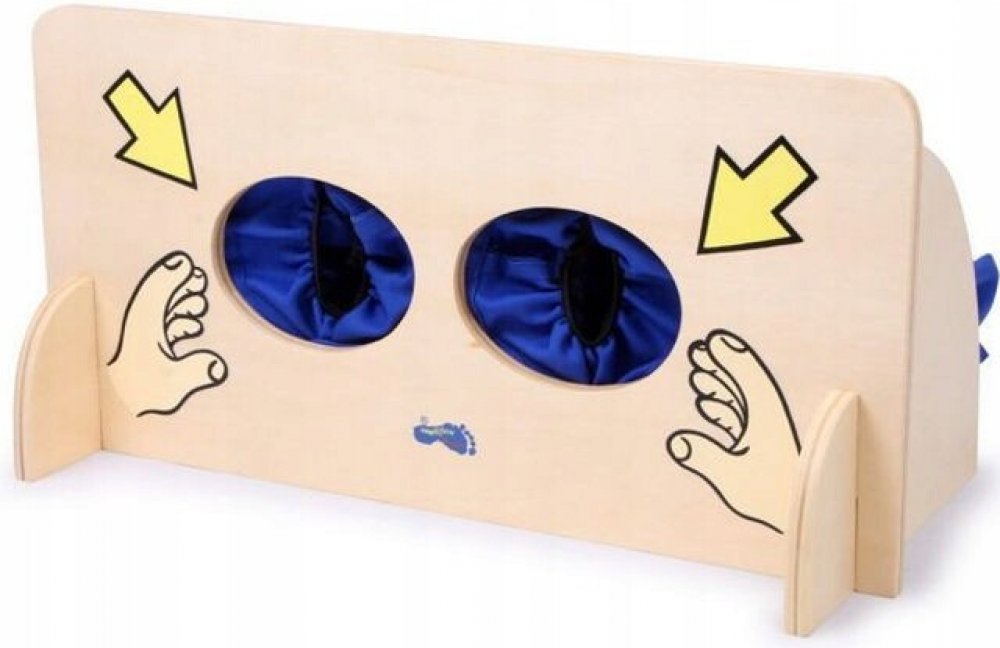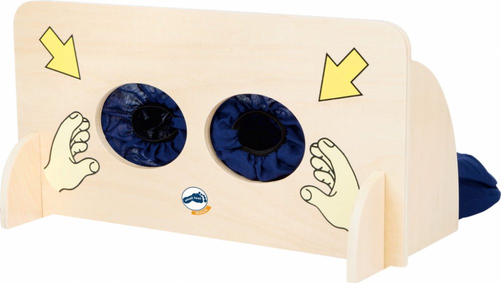 Různé předměty ukryjte do látkového sáčku za dřevěnou stěnou. Kapsa je opatřena zipem, pro snazší vkládání předmětů. Děti vloží ruce do textilních rukávů a podle hmatu se snaží rozpoznat, o jaký předmět se jedná. Hlavní vlastnosti: hra je vhodná i do školek nebo družin pomáhá rozvoji poznávacích a motorických dovedností rozměr: 40x19x20 cm materiál: dřevo