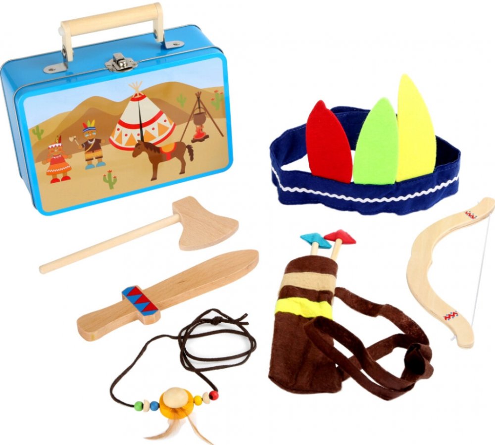 Divoký, divoký západ! Kovové pouzdro s perfektním přestrojením pro pravého indiána. Winnetou zezelená závistí! Součástí je samozřejmě čelenka z plsti, ozdobená třemi barevnými péry. Luk a šíp jsou umístěny v plstěném pouzdře a sekera s nožem jsou zdobeny koženými pásky a barevnými korálky. K dokončení tohoto outfitu samozřejmě nesmí chybět indiánský náhrdelník.