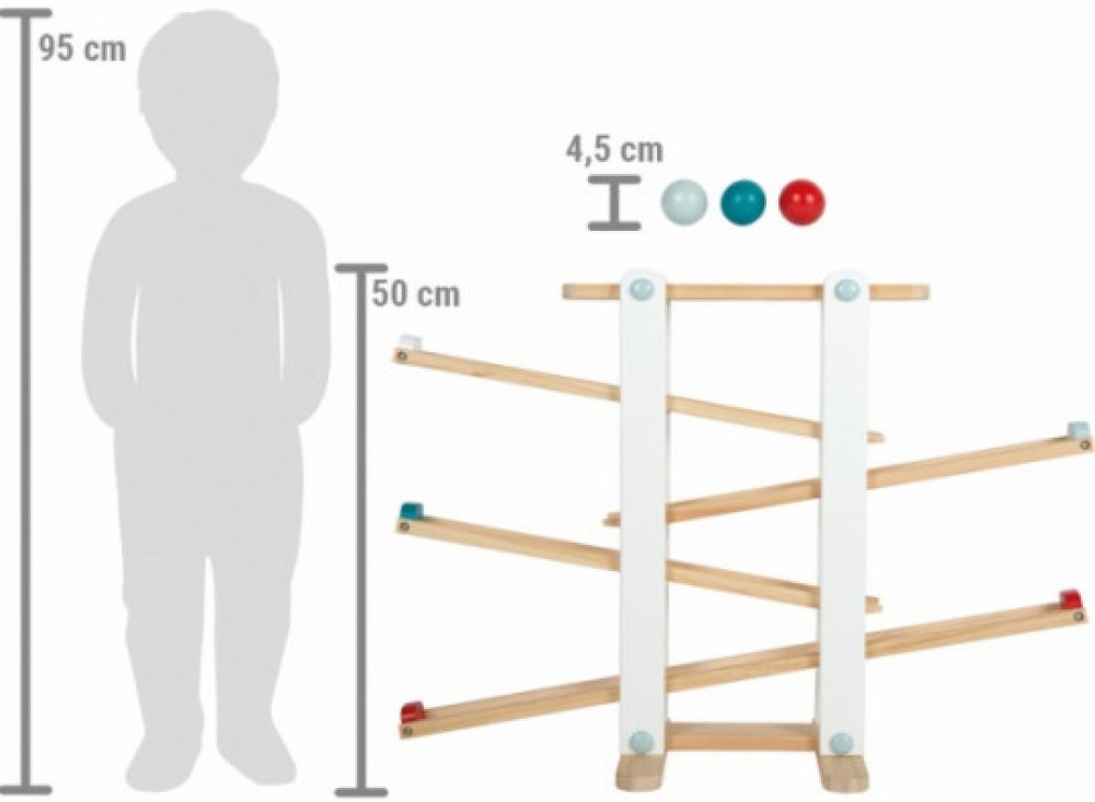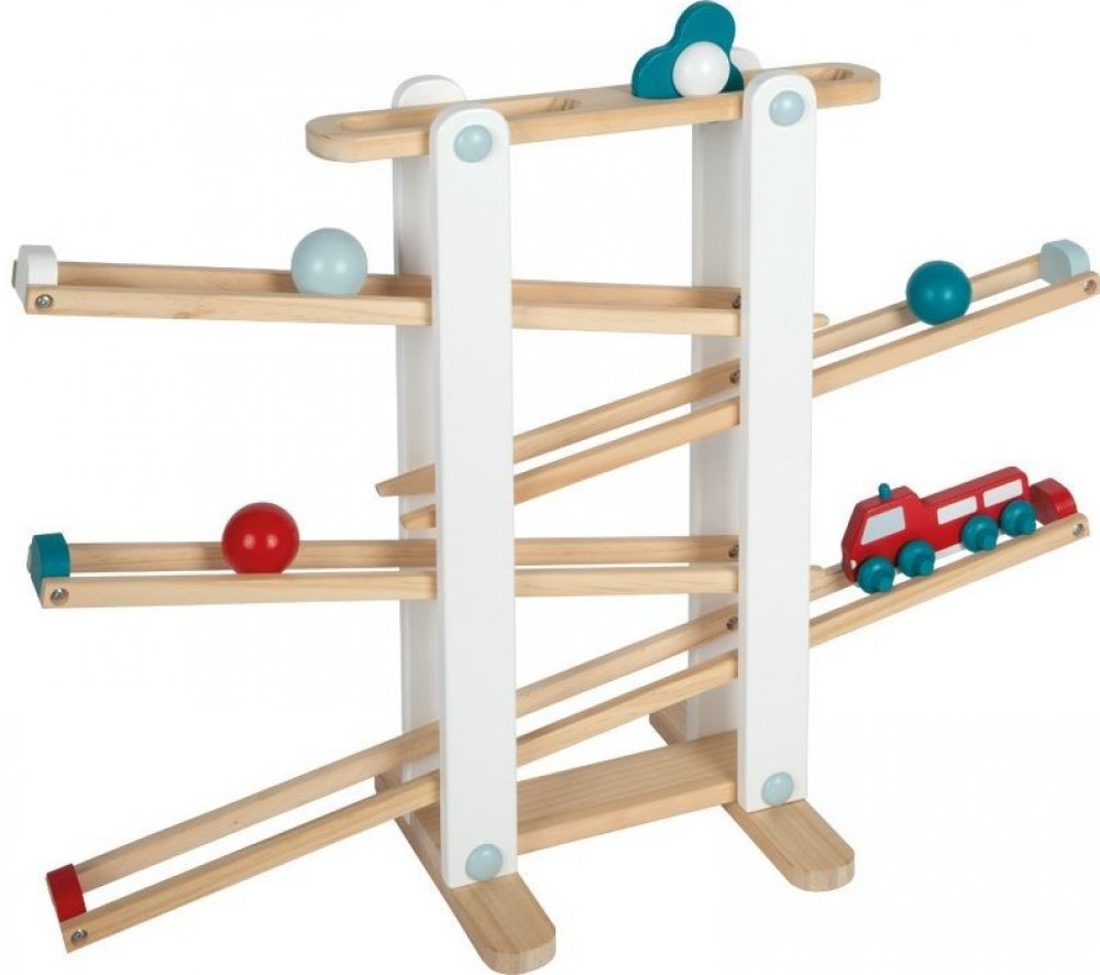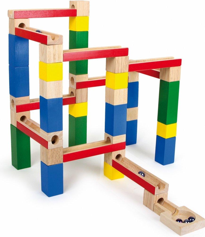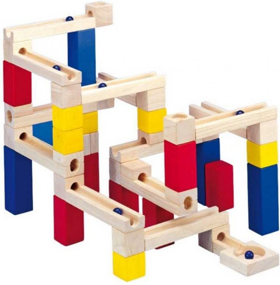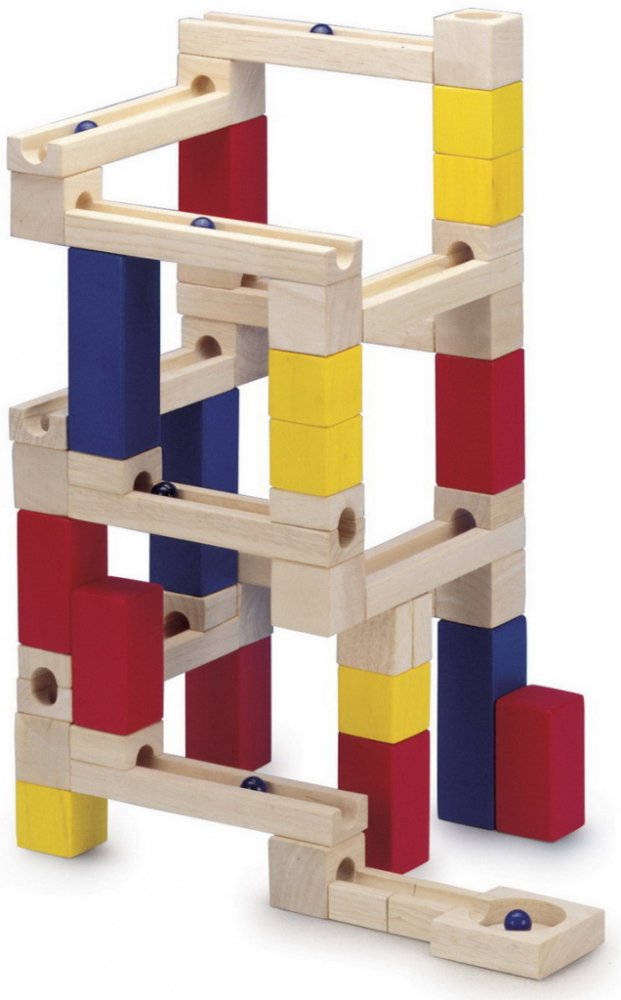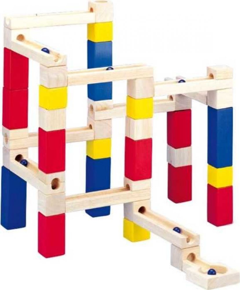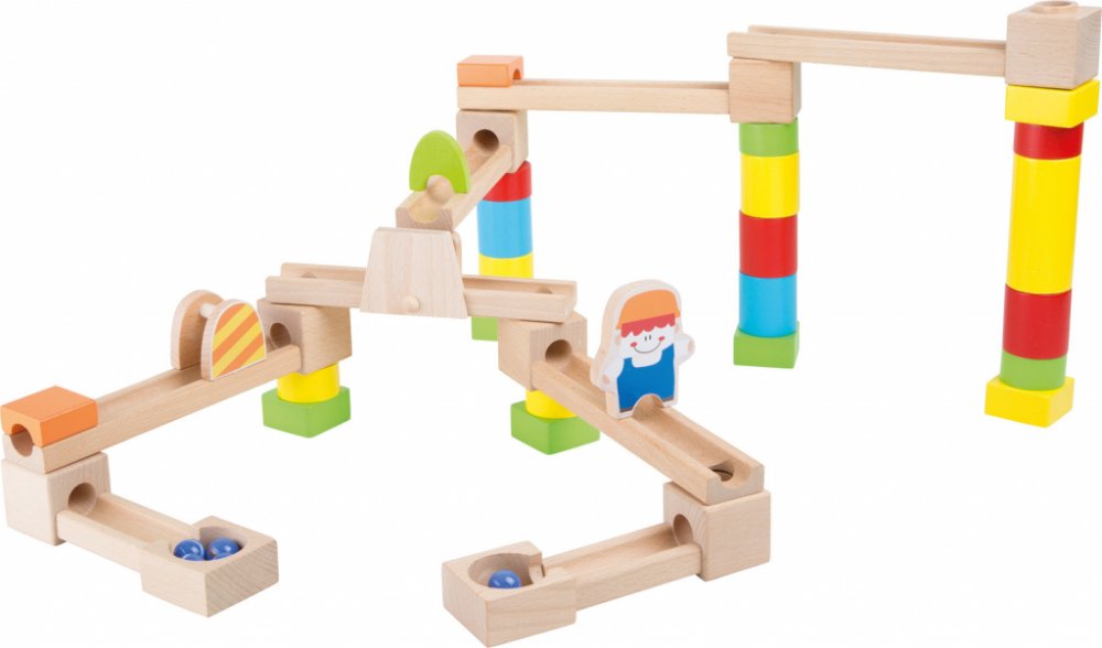 Kvalitně zpracované stavební kostky z přírodního a barevně lakovaného dřeva nabízejí malým architektům prostor pro jejich představy. Pokud díly správně postaví, vytvoří dráhu pro kuličky. Takto školí motoriku, prostorové vidění a logické myšlení. Čím více sad koupíte, tím delší bude dráha.