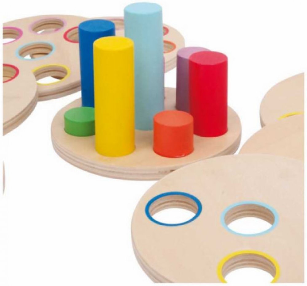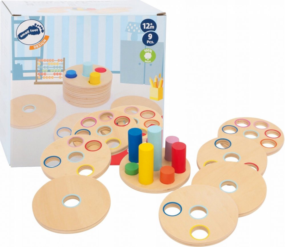 Dobře si prohlédni, přemýšlej, zkoušej a vhodně nasuň – skvělá nasouvací hra pro trénování motoriky a koordinace ruky a oka! 8 pevných kotoučů (tloušťka 1 cm) z jemně broušené překližky mají být nasunuty na barevné tyče. Vzhledem k tomu, že jsou tyče různých délek a každý kotouč má vždy o jeden otvor méně než předchozí, je pouze jedno řešení! Německá firma Legler zaměřená na výrobu kvalitních dřevěných hraček od roku 1996. Všechny dřevěné hračky značky small foot mají označení CE a jsou vyráběny dle evropské normy pro bezpečnost hraček EN 71. Použité barvy jsou speciálně vyvinuty pro dřevěné hračky a jsou odolné i proti slinám dětí. Dřevo, které se používá pro tyto hračky, většinou pochází z lesnických společností zapojených do zalesňování. To nabízí všem zákazníkům možnost přispět k zachování přirozeně rostoucích lesů. Dřevěné hračky small foot jsou zářivě barevné produkty, které jsou vyrobeny převážně z přírodních surovin - dřeva. Dětem dělají radost od útlého věku, rozvíjí jejich hmatové a smyslové dovednosti. Cílem značky small foot je podporovat duševní a fyzický vývoj dětí.