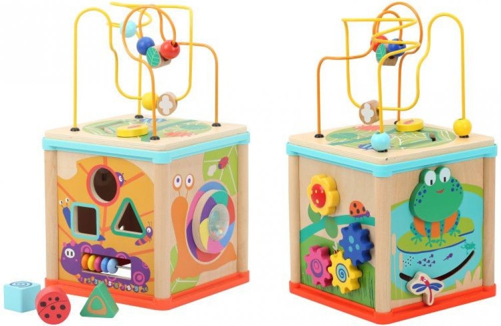Krásná motorická kostka Garden nabízí mnoho podnětů k objevování a zkoumání. Dominantní je kovový labyrint. Kostka nabízí i vkládání tvarů, poznávání barev a další motorické prvky.