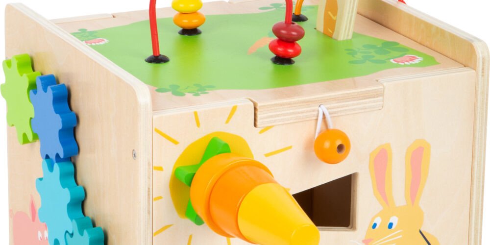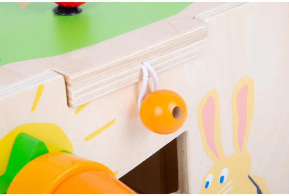 Small Foot Motorická kostka Králíček Korálkový labyrint ve tvaru králíčka. Děti si mohou hrát na pěti stranách motorické kostky, na každé straně najdou jinou aktivitu. Například vkládání dílků, otáčení ozubených koleček, korálkový labyrint, xylofon, je to perfektní hračka k procvičení motoriky. Na jedné ze stran najdete čouhající mrkev, což je šroubující se nasazovačka. Svrchní stranu s labyrintem...
