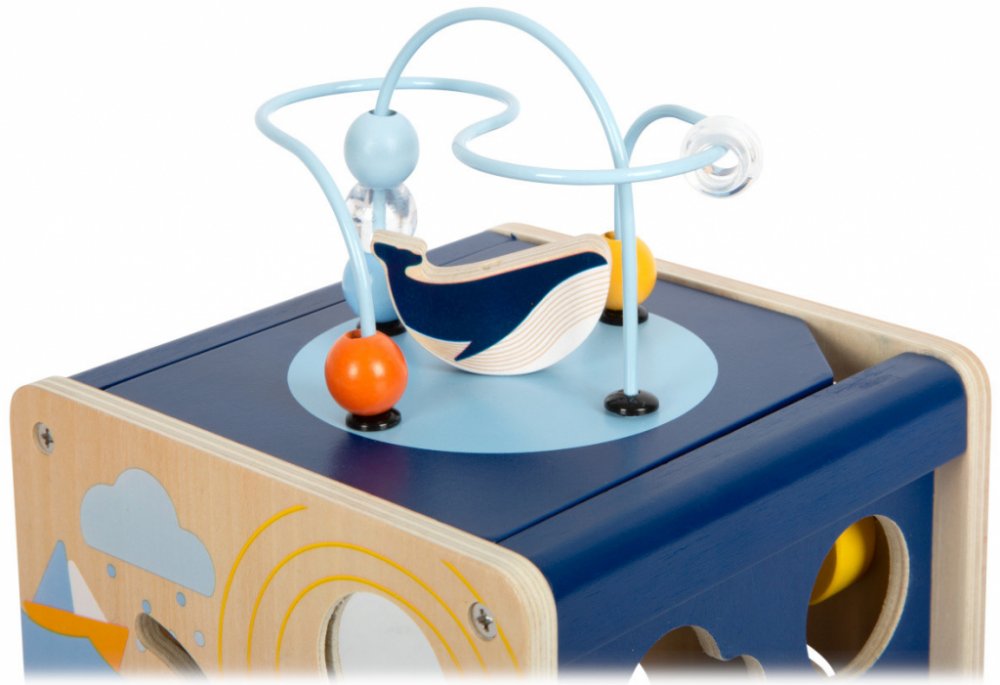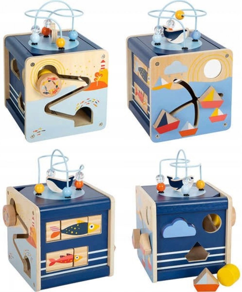 Motorická hračka s motivem podmořského světa. Zaujme veselými detaily a díky modernímu zbarvení a vysokému podílu přírodního dřeva je také dekorativním poutačem. V každém dětském pokoji vytvoří námořnickou atmosféru. Je všestranná, pokud jde o hraní, učení či objevování. Jejím prostřednictvím lze procvičovat jemnou motoriku a rozvíjet trpělivost i soustředění. Hračka je bohatě dekorovaná a děti budou při hrách provázet stvoření ze světa pod hladinou. Motorická kostka přichází s tradiční zábavou na pěti stranách. Lze si tak hrát např. s korálkovým, nebo posuvným labyrintem nebo vkládačkou. Výrazné barevné kontrasty a zrcadlo stimulují smysl pro zrak. Kostka má odnímatelné víko, lze tedy uložit vkládací kostky dovnitř pro úsporu místa.
