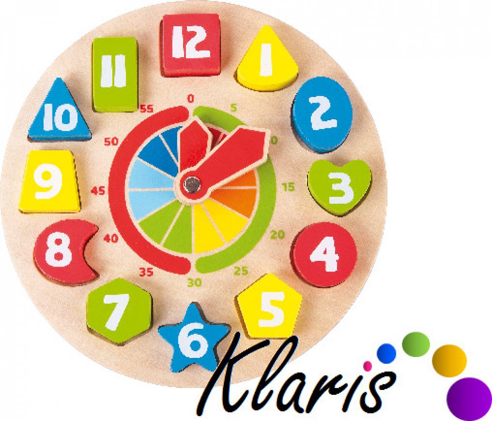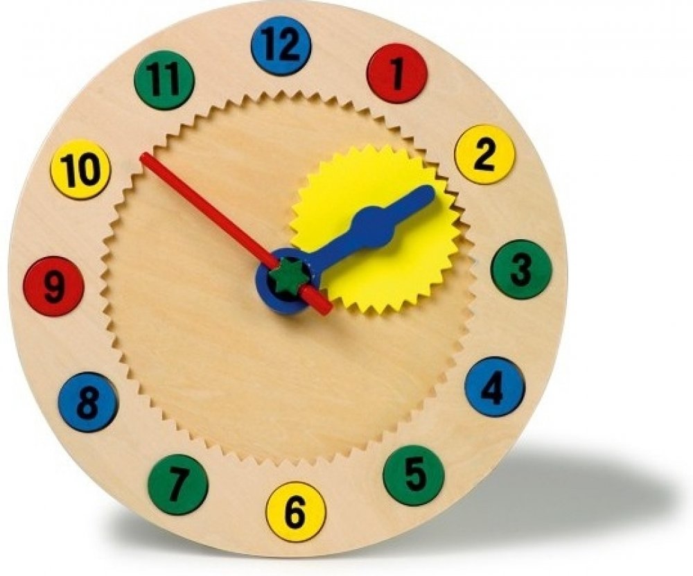 Praktická naučná pomůcka pro výuku poznávání času. Velké dřevěné hodiny s veselými barvami, otáčecími ručičkami a vkládácími kostkami potěší holky i kluky. Naučte děti poznávat čas formou zábavy:)