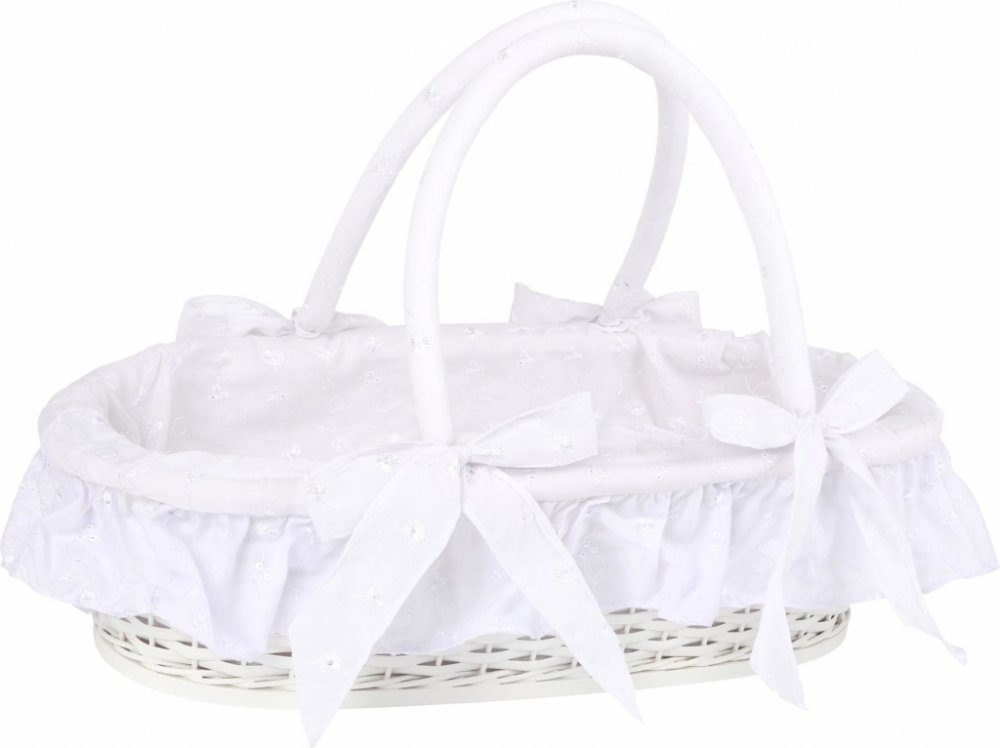 Každá panenka je pohodlně přepravována v tomto nosítku. Bílý proutěný koš je vystlán látkou s polštářem a peřinkou. Polstrované úchyty z textilu se dobře drží.
