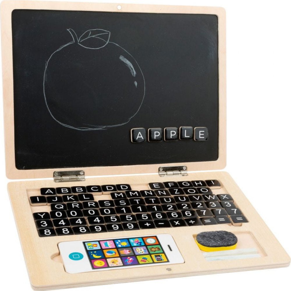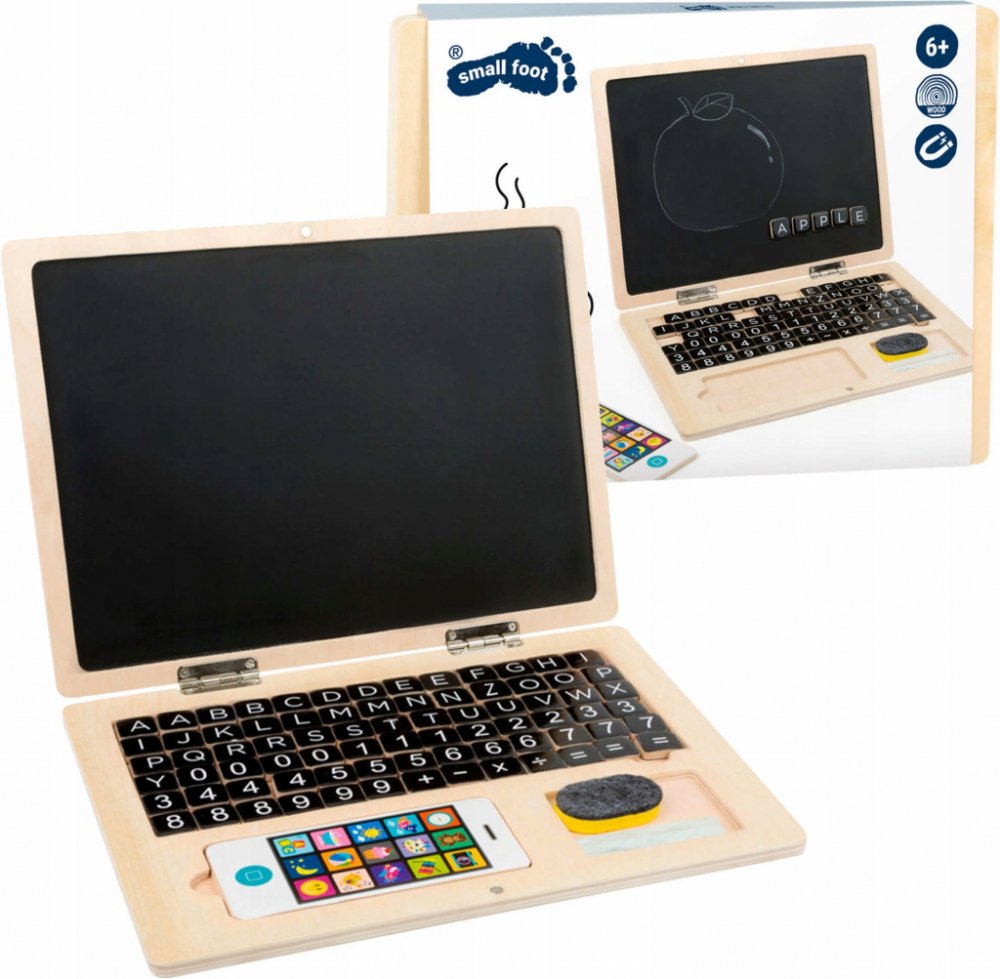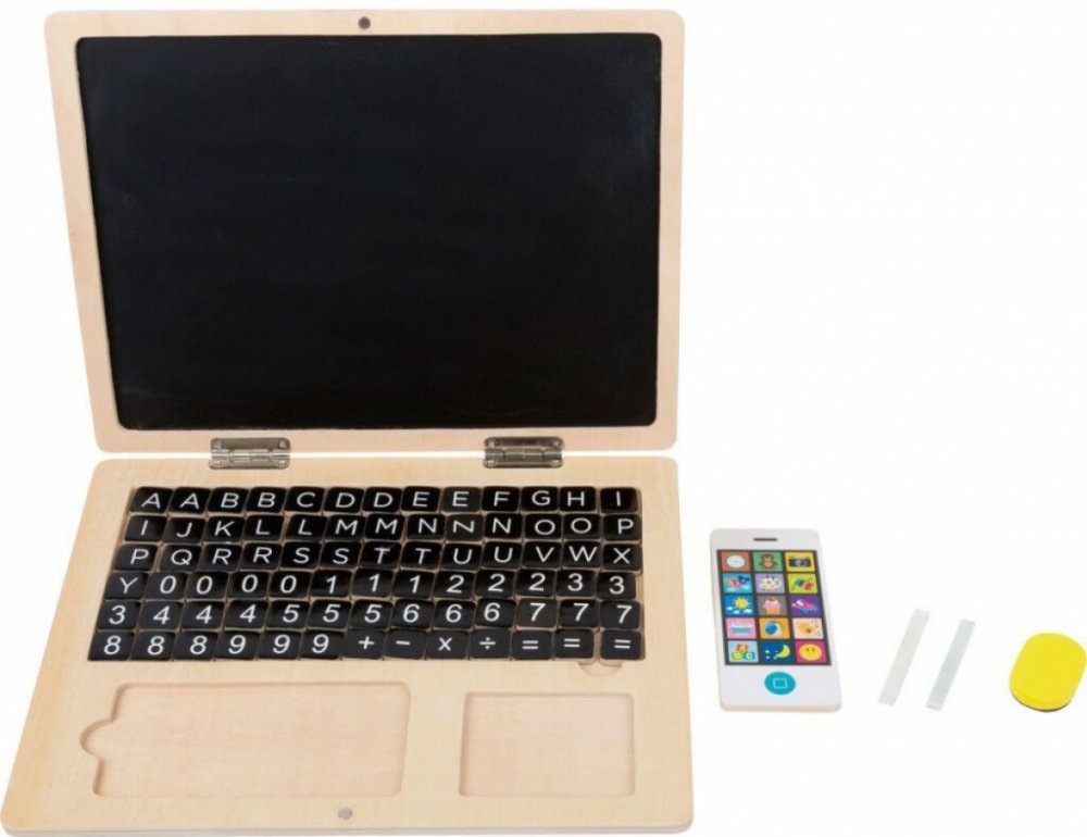 Chtějí vaše děti být jako vy? Psát a pracovat na notebooku? Poříďte jim vlastní dřevěný počítač – děti budou mít radost a vy se nemusíte obávat o rozpracovaný projekt. Dílky s písmenky, čísly a znaky mohou děti jednoduše přesouvat a vytvářet tak slova nebo řešit matematické problémy a to na magnetické destičce – displeji notebooku. Křídou pak děti mohou kreslit obrázky nebo psát slova, které jednoduše smyjí houbičkou. V balení je také dřevěný smartfon. Notebook lze jednoduše přemísťovat a přepravovat díky jeho kompaktní velikosti. Balení obsahuje 83 dílků.