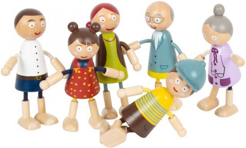 Hezké dřevěné panenky do domečku - rodinka 6ks, které zaujmou svým vzhledem a zpracováním. Nová generace panenek do domečků, které si děti zamilují. Figurky s moderním designem, které drží svůj tvar. Panenky jsou ohýbatelné, vyrobeny ze dřeva a flexibilitu zajišťují textilem opletené drátky. Nalezneme zde postavičky maminky, tatínka, babičky, dědy, bratra a sestry. Rozměr dědy je 11x7,5x3cm a sest...