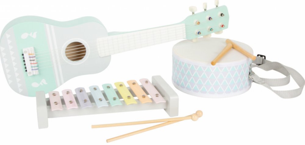 Tento set hudebních nástrojů se skládá z kytary, xylofonu a bubnu v pastelových barvách. Tři hudební nástroje v krásnem designu promění dětský pokoj v koncertní sál. S touto hračkou mohou děti získat první zkušenosti s rytmem a zvukem, podporuje také dětskou kreativitu. Hlavní vlastnosti: jemné pastelové barvykytara, xylofon s dvojící vlastních paliček a bubínek s dvojicí vlastních paliček
