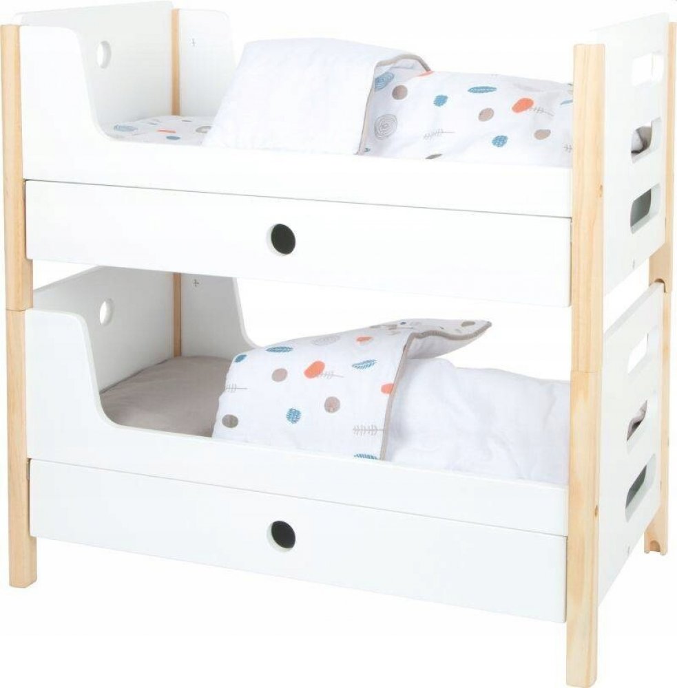 Prvotřídní patrová postel! Toto lůžko zaujme svou funkčností a designem a díky svému skandinávskému tvaru a jemnému designu se bude hodit do interiéru dětského pokoje. Moderní oboustranné povlečení neutrální z hlediska pohlaví a velké přikrývky umožňují panenkám a plyšovým zvířatům o velikosti až 46 cm spát mimořádně pohodlně ve dvou postýlkách umístěných jednotlivě nebo na sobě. Zásuvky postele s víkem se skvěle hodí pro ukládání doplňků pro panenky. Díky obzvláště vysoké kvalitě zpracování, stabilní konstrukci, zaobleným hranám a viditelným prvkům z masivního dřeva je hračka stylovým doplňkem dětského pokoje. Předmontované díly usnadňují montáž.