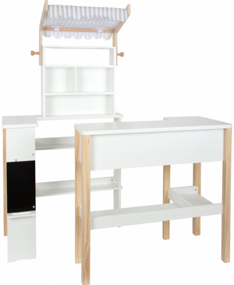 Kompaktní, modulárně konstruovaný obchod s odnímatelnou látkovou markýzou, můžete flexibilně začlenit do dětského pokoje. Díky kombinaci neutrální bílé a přírodního dřeva, krásně zapadne do každého dětského pokoje. Včetně popisovatelná tabule s policí na křídu. Látková markýza mu dodává typický vzhled obchodu.