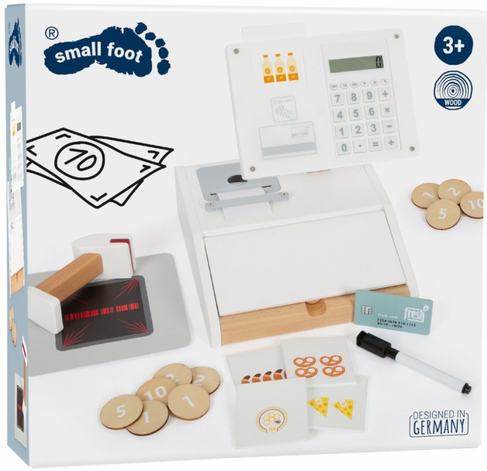čtečka čárových kódů, trhací role účtenek, otočný monitor, fungující kalkulačka, platební karta, karty produktů, 15 oboustranných dřevěných mincí