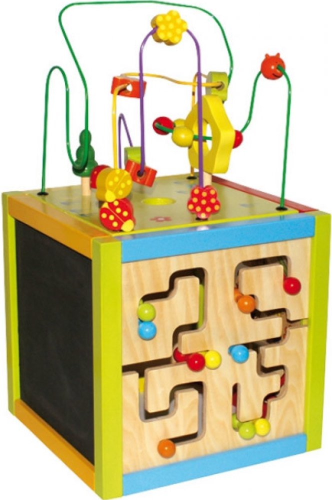 Velká dřevěná kostka s pěti různými aktivitami pro rozvoj vašeho dítěte.