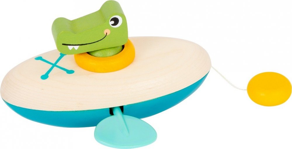 Vodní zábava s krokodýlem! Jeho kánoe je vyrobená ze dřeva a plastu, po vodě dokáže plavat úplně sám – má natahovací mechanismus. S touto hračkou si děti užijí ve vodě mnoho zábavy. Pro delší životnost hračky ji po vytažení z vody pořádně osušte. Vodní hračky vyrobené ze dřeva jsou ekologičtější alternativou plastových a gumových hraček. Při hře s krokodýlem se děti naučí o principu příčiny a následku, díky natahovacího mechanismu.