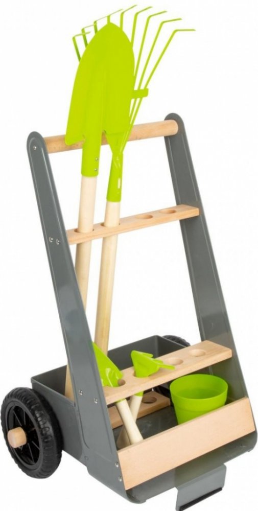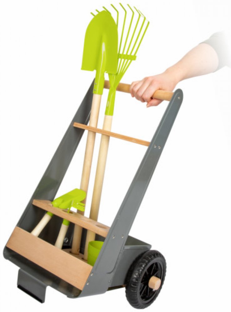 Small Foot Zahradní vozík s 5 ks nářadí Mladí nadšení zahradníci a zahradnice teď mohou začít pracovat na svém vysněném záhonku. Stabilní vozík vyrobený z bukového dřeva a kovu lze jednoduše tlačit či tahat po zahradě, má k tomu totiž stavěná kola. Dobře promyšlený design myslel na úložný prostor, vzhled i bezpečnost. Hrábě, rýč i lopata mohou být uloženy tak, aby směřovaly pryč od hlavy dítěte. H...