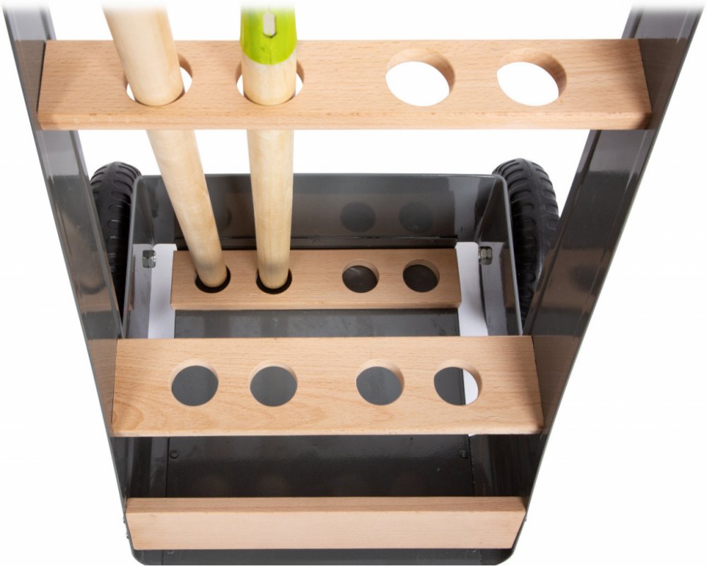 atraktivní a robustní mix materiálů – buku a kovulehký přesun díky pevným a velkým kolůmosm otvorů pro uložení zahradního náčiníjednoduše omyvatelnýkovové nožičky opatřeny gumou pro lepší stabilituk doplňkům vozíku patří rýč, hrábě, plastový květináč, lopatka a hrabky