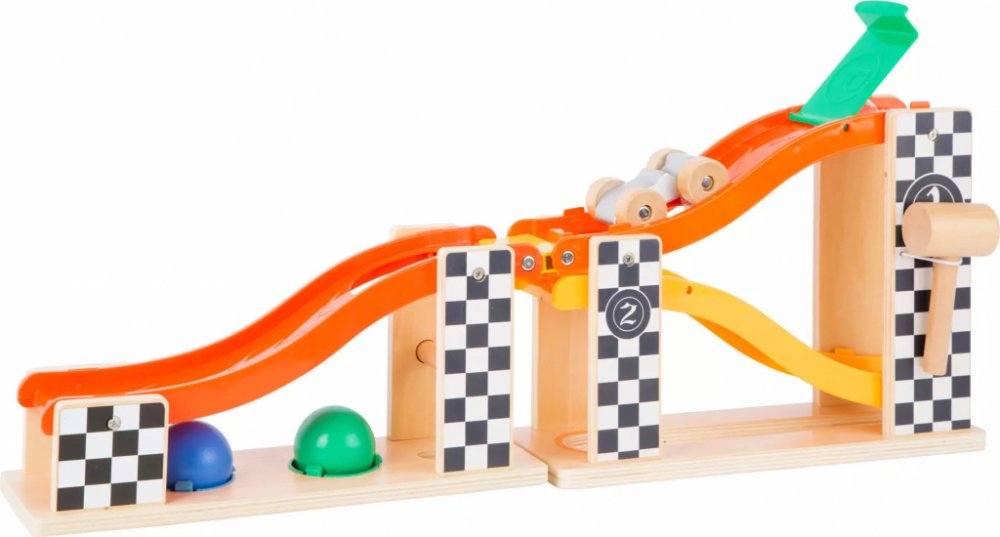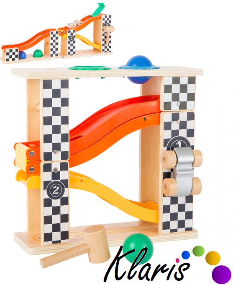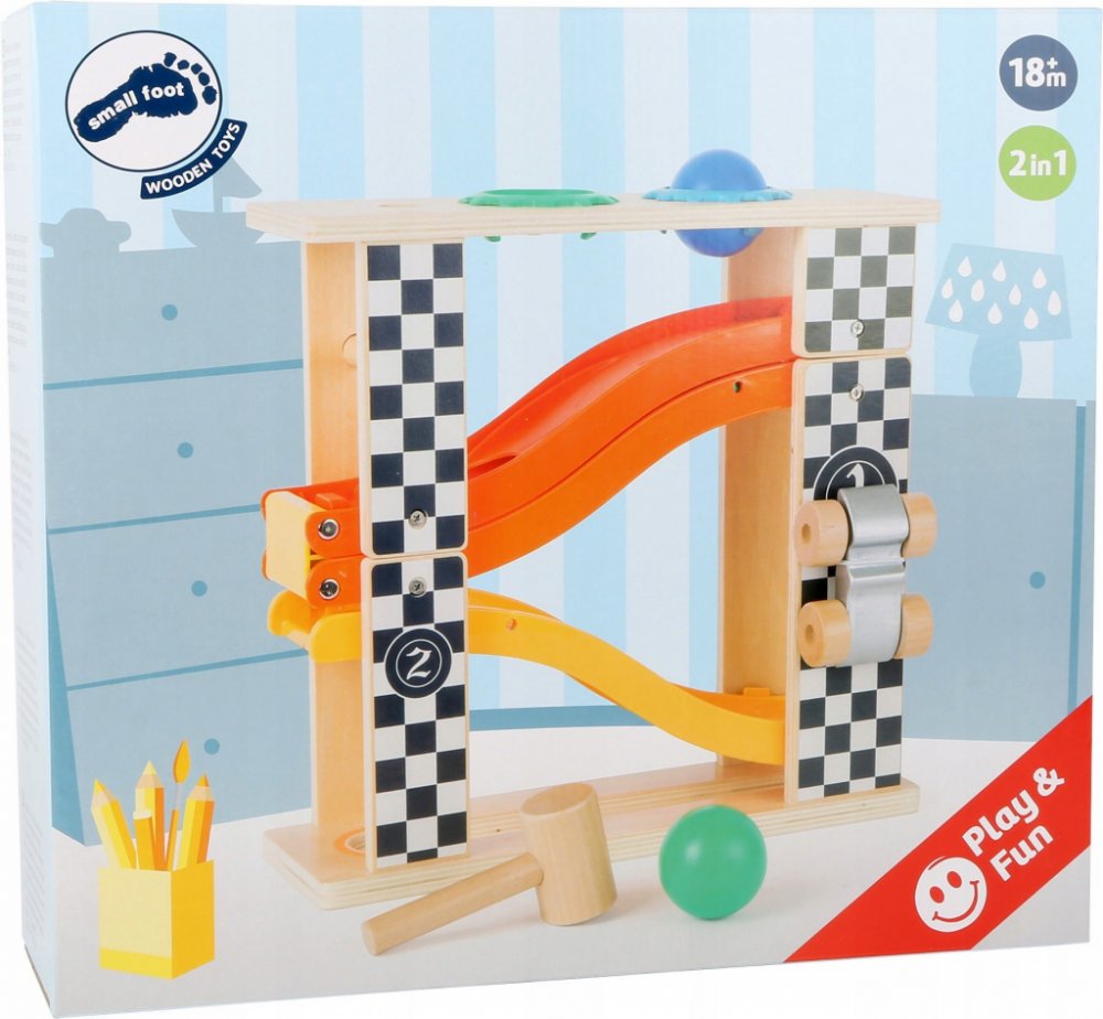 Multifunkční skládací kuličková dráha s kladívkem pro zatloukání kuliček nabízí různé variace hry. Součístí je i autíčko Formule 1, které může na dráze také závodit.