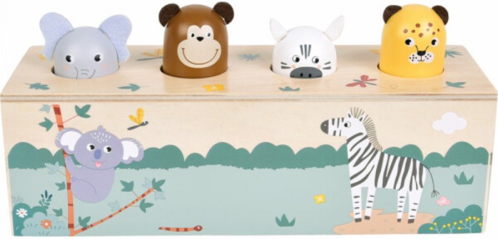 Tato interaktivní dřevěná hračka z FSC® 100% certifikovaného dřeva rozhýbe čtyři oblíbená zvířátka ze safari a navíc vydává reálné zvířecí zvuky! Stačí stisknout jedno zvířátko a ozve se jeho typický zvuk. Děti se tak hravou formou učí poznávat hlasy zvířat a zároveň objevují princip příčiny a následku. Čtyři detailně zpracované hlavičky – slon, opice, zebra a leopard překvapí děti veselým pohybem...