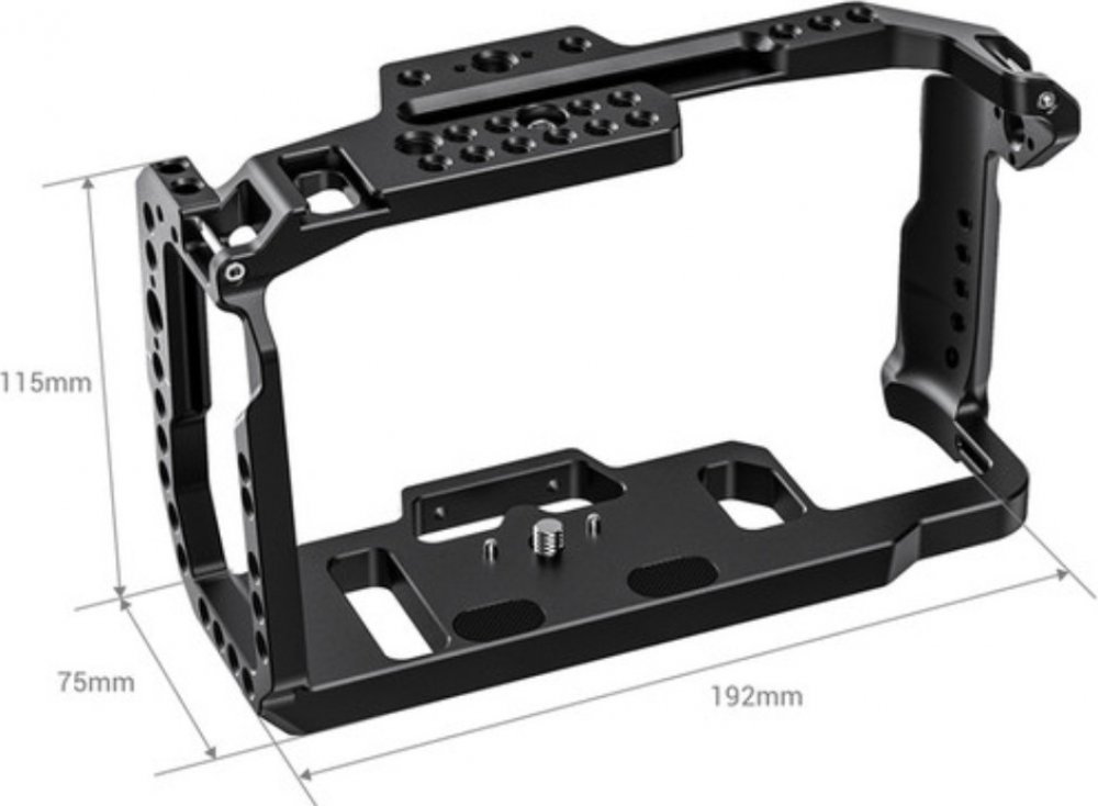 Klec s několika montážními body (lišta NATO, otvory se závitem 1/4"-20 a 3/8"-16, otvory pro umístění ARRI a cold shoe patky) pro příslušenství