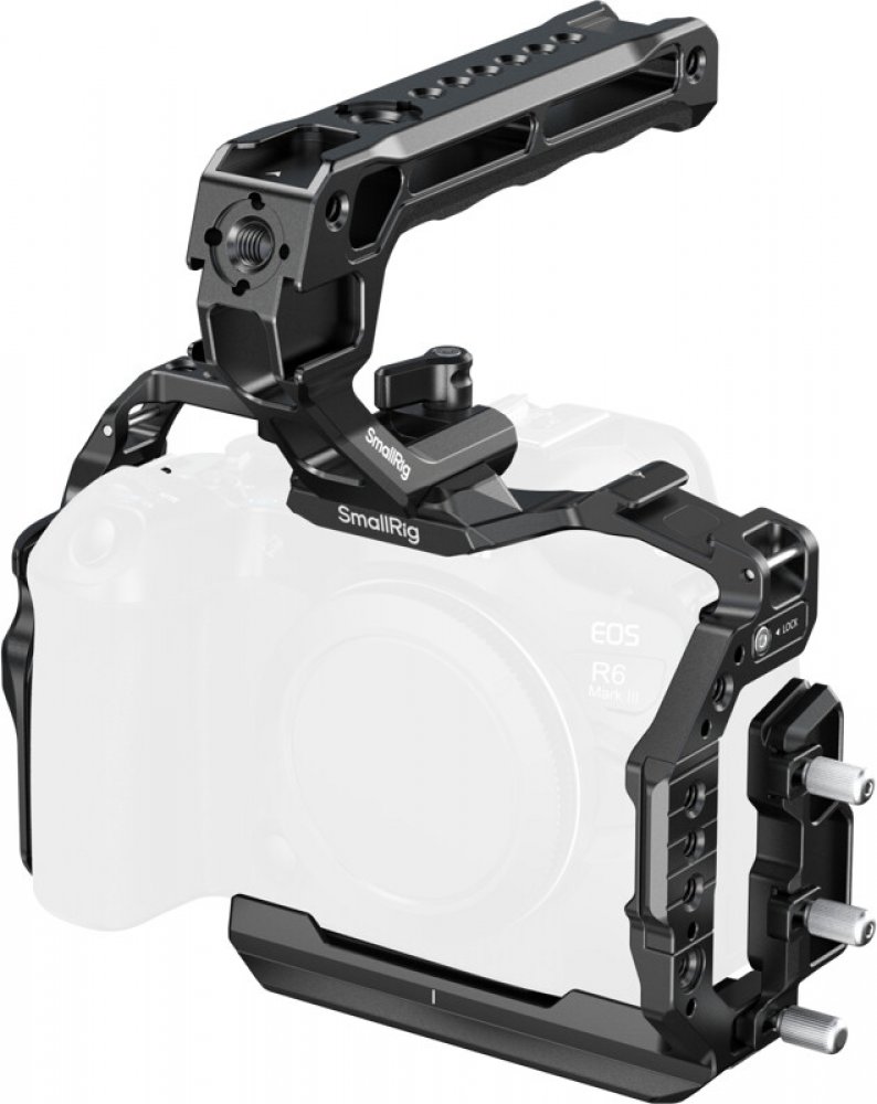 Sada SmallRig 5955 Extension Cage Kit pro fotoaparáty Canon EOS R6 Mark III, R6 Mark II a R5 Mark II nabízí kompaktní a odolné řešení pro připevnění příslušenství a ochranu. Sada obsahuje tvarově přizpůsobený klecový rám pro fotoaparát, svorku pro kabel HDMI a horní rukojeť s několika závity 1/4"-20 a 3/8"-16, zásuvku QD a základovou desku typu Arca, která je ideální pro fotografování z ruky i ze ...