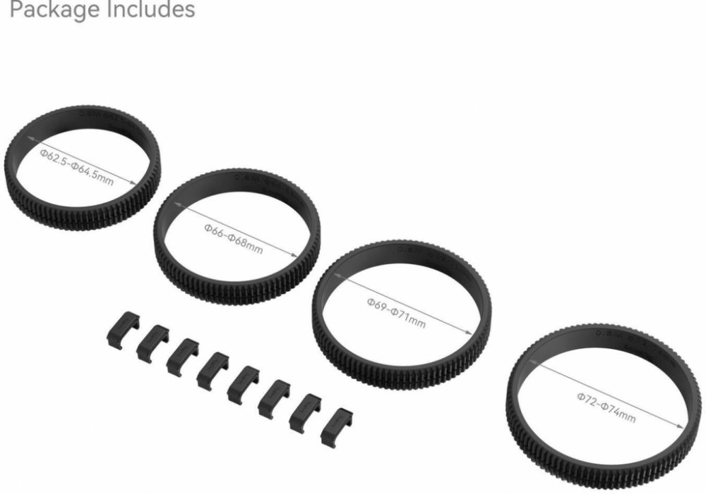 SmallRig 62,5-64,5 mm / 66-68 mm / 69-71 mm / 72-74 mm Sada bezešvých zaostřovacích kroužků 4186 se dokonale hodí pro objektivy digitálních zrcadlovek a bezzrcadlovek a funguje se systémem follow focus. Obsahuje standardizované ozubené kroužky 0,8 MOD 62,5-64,5 mm / 66-68 mm / 69-71 mm / 72-74 mm, lehké a pružné pro snadnou instalaci a bezproblémové uchycení, a také zarážky A/B, které zaháknou kroužek v libovolném bodě a umožní tak volné nastavení ohniskové vzdálenosti při práci zejména s miniaturním Follow Focusem 3010 a Follow Focusem F60 3850. Celkově se sada vyznačuje plynulým otáčením a těsným uchycením pro přesné zaostřování.1. 360° bezproblémové nasazení a neomezený zoom.2. Nastavitelné zarážky A/B pro automatickou kalibraci objektivu.3. Standardní převod 0,8 MOD pro přesný pohon.4. Snadná instalace s pružností.