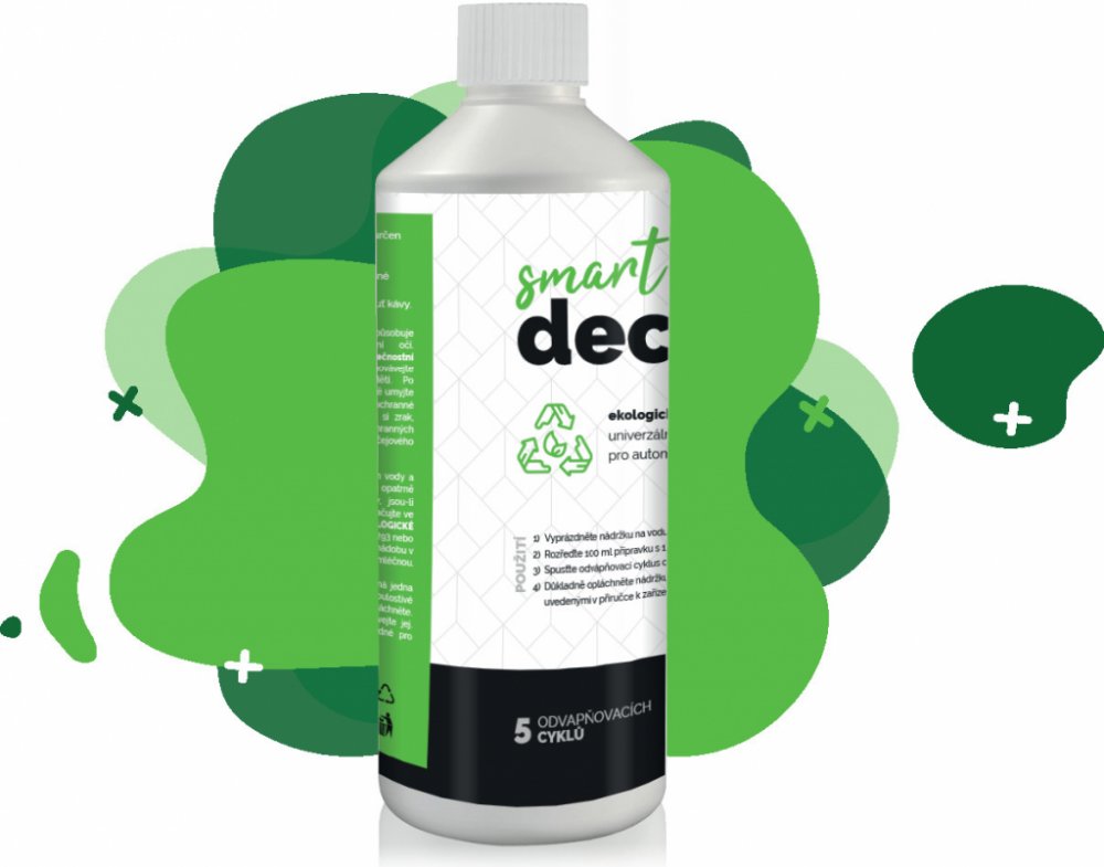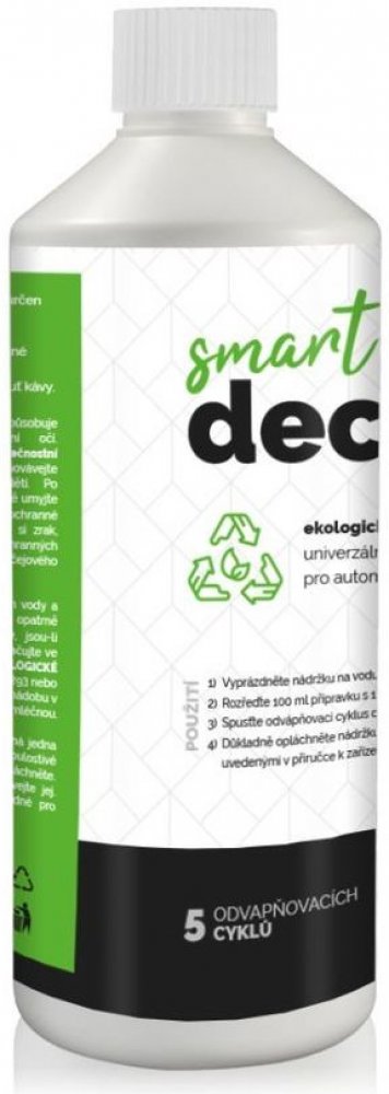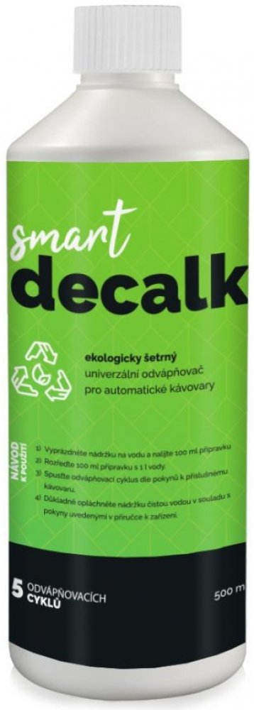 Odvapňovač smartDecalk. Kvalitní český tekutý univerzální odvápňovač pro domácí i profesionální použití. Navržen speciálně pro kávovary DeLonghi, Philips/Saeco, Jura a Nivona. Výrobek je na bázi kyseliny mléčné, která je biologicky odbouratelná a šetrná k životnímu prostředí. Tekutý odvápňovací prostředek, který je určen na pravidelné čištění vodního kamene v automatických kávovarech různých znače...
