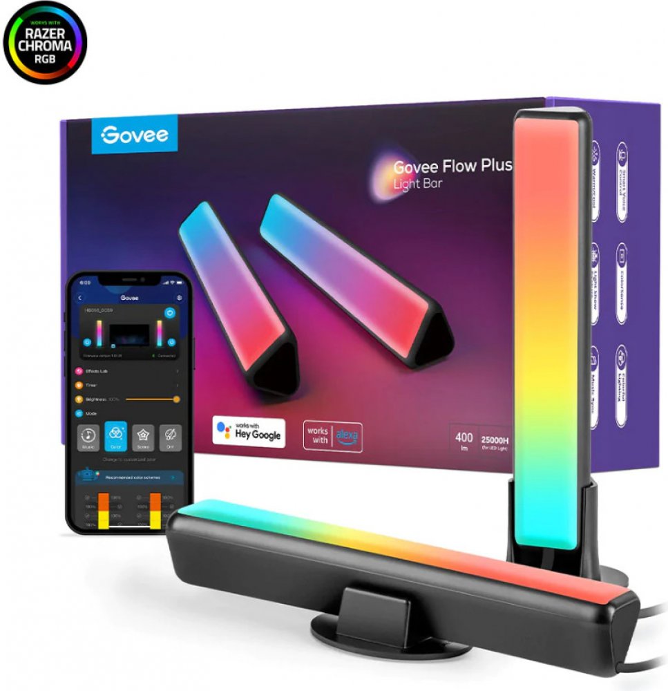 Govee Flow Plus představuje chytré podsvícení určené pro televizi, počítač nebo volný prostor. Technologie RGBICWW umožňuje zobrazit až 57 barev najednou z 16 milionů celkové palety, včetně bílé teploty 2200–6500K. Kromě 12 scénických režimů obsahuje také 4 dynamické režimy pro synchronizaci s hudbou. Instalace je flexibilní – na stěnu, stůl nebo monitor – a ovládání probíhá hlasem, přes aplikaci Govee Home nebo Control box.