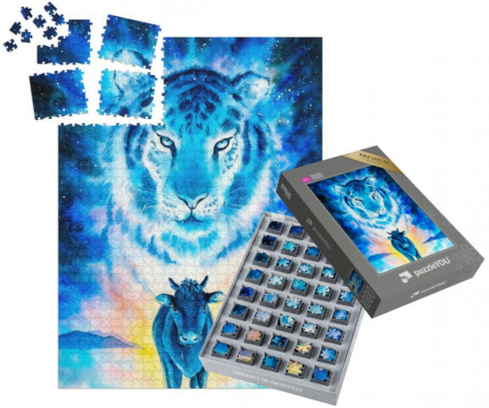 Skládačka SMART SORTED® | Puzzle 1000 dílků „Býk a tygr, modré světlo, akvarel“ - Osobní dárek k narozeninám, svatbě, výročí, Vánocům, Dne matek nebo Dni otců. 48–2000 dílků a SMART SORTED 1000 dílků, tematická krabička s vlastním textem zdarma, česká výroba, kvalitní zpracování. Dnes objednáte, zítra odešleme.