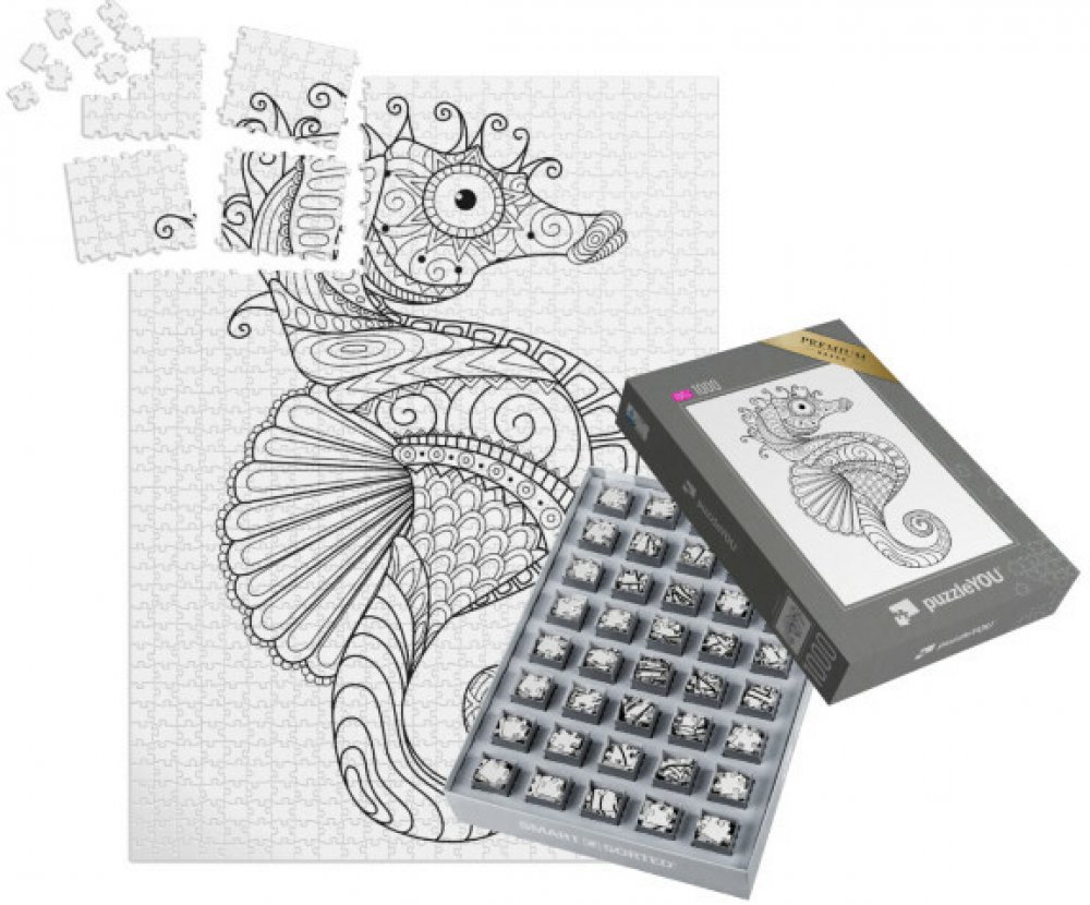 Skládačka SMART SORTED® | Puzzle 1000 dílků „puzzleOMALOVÁNKY: Mořský koník“ - Osobní dárek k narozeninám, svatbě, výročí, Vánocům, Dne matek nebo Dni otců. 48–2000 dílků a SMART SORTED 1000 dílků, tematická krabička s vlastním textem zdarma, česká výroba, kvalitní zpracování. Dnes objednáte, zítra odešleme.