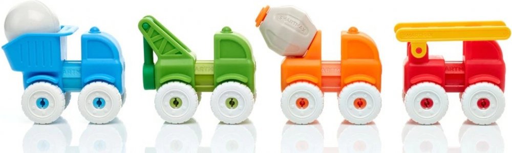 Ideální jednoduchá stavebnice SmartMax pro nejmenší děti využívá ke spojování jednotlivých částí magnetismus. Sada 4 magnetických tyček a nasazovacích předních a zadních částí autíček ve čtyřech různých barvách. Děti si tak snadno sestaví 4 různá autíčka: hasičské auto, náklaďák, míchačku a nakladač. Na hraní mají také k dispozici jednu magnetickou kouli, která poslouží nejen jako náklad do náklaď...