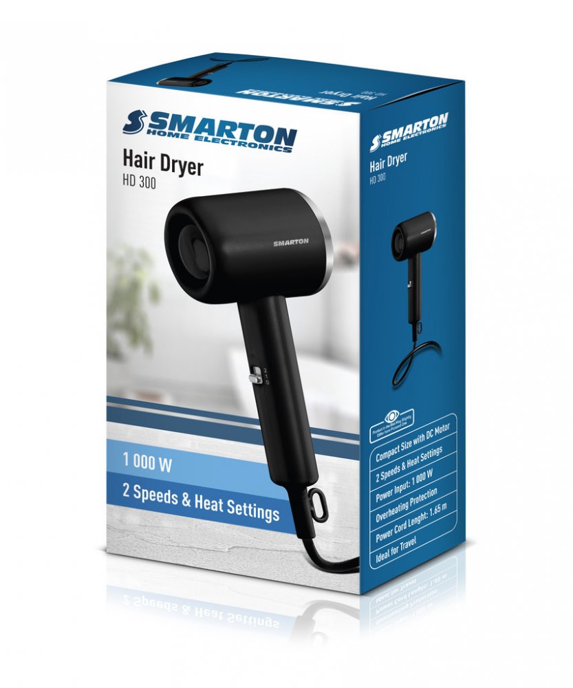 Fén Smarton HD 300 je užitečný nejen pro každodenní použití, ale díky svým kompaktním rozměrům je vhodný i na cesty. Fén je vybaven 2 rychlostmi a teplotami pro pohodlné vysoušení vlasů.