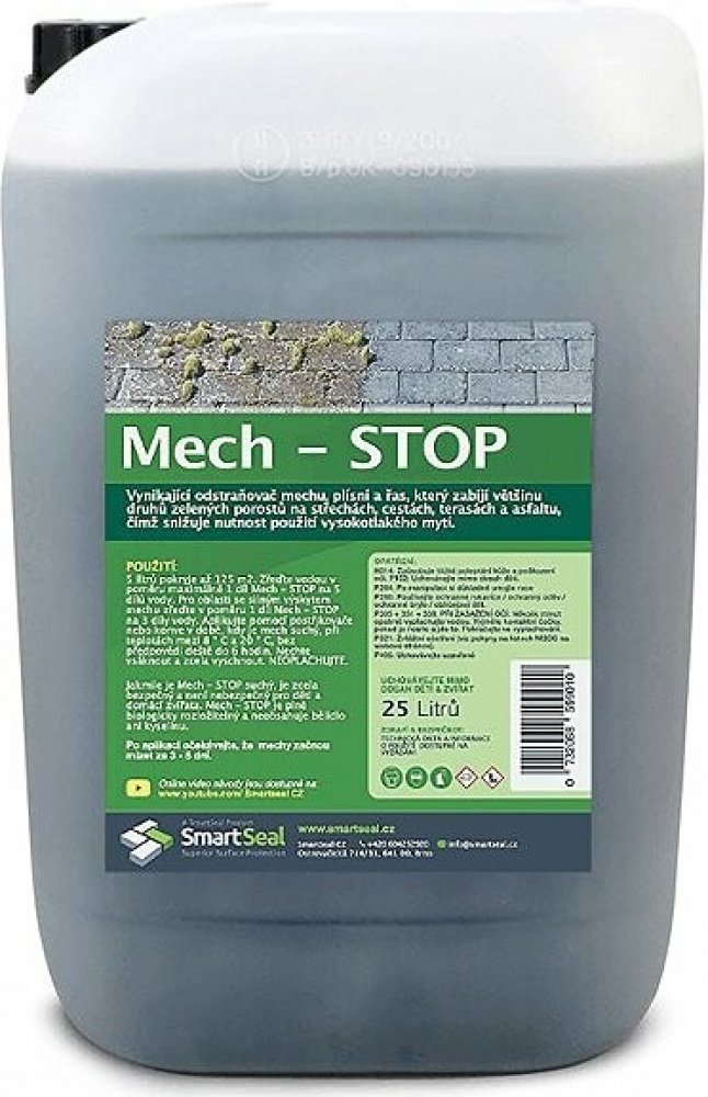 Klíčové vlastnosti SMARTSEAL čističe Mech-stop 25 lMech-stop odstraní mechy a lišejníky z většiny povrchů: střechy, příjezdové cesty, asfalt nebo terasy25 l ošetříte plochu až 500 m²V závislosti na znečištění se dá produkt ředit 1:5Po aplikaci není potřeba oplachovat Mech začne odumírat do 5 dnů a není potřeba použít vysokotlaký čistič nebo drhnout kartáčem