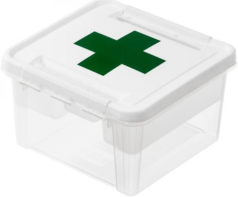 Čtvercový tvar boxu usnadňuje skladování. Malý tak, že umožnuje použití v koupelnách, komorách, autě nebo karavanu. Dostatečně objemný, aby se do něj vešly všechny základní léky, náplasti, obvazy či dezinfekce. Rozměry: 28 x 28 x 17 cm