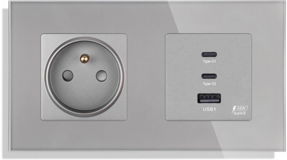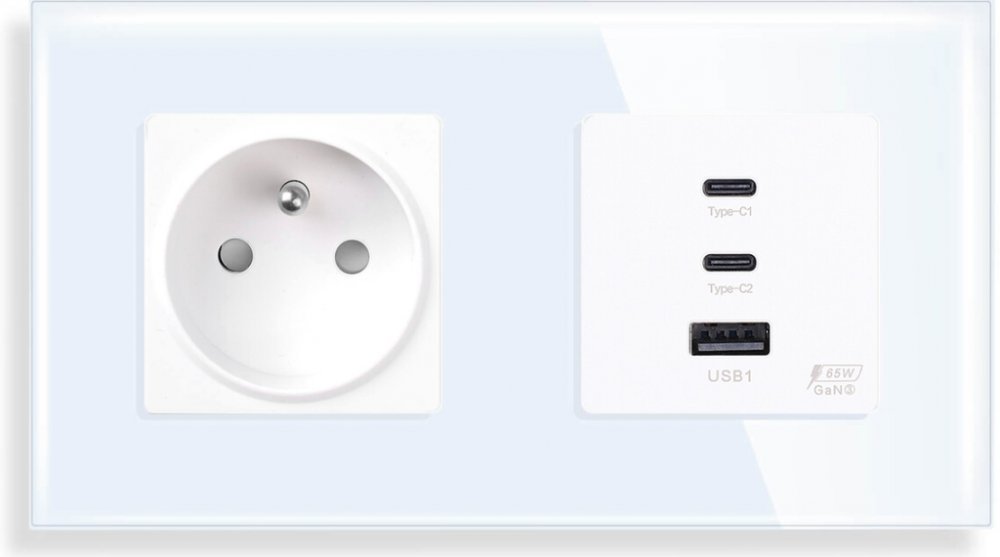 Exkluzivní kombinace zásuvky 230 V a modulu trojité nabíječky USB (2x USB-C + USB-A) v skleněném rámečku spojuje eleganci s modernitou. Trojité nabíječky USB disponují podporou rychlonabíjení. Maximální hodnoty závisí od využití portů: