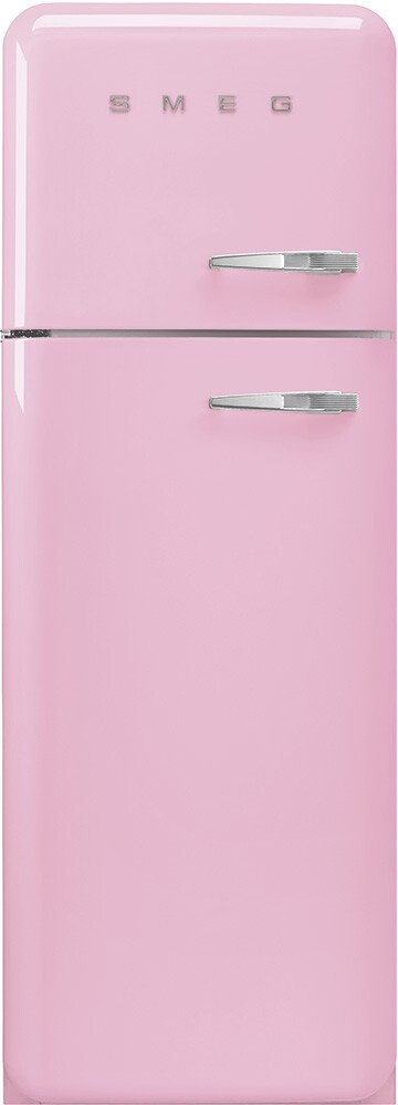 Retro kombinovaná chladnička Smeg FAB30LPK6 ve stylu 50. let, barva růžová, energie C, spotřeba 135 kWh za rok, objem chladnička 222 l, Objem 0 ° C zóna 29 l , objem mraznička 72 litrů, hlučnost 34 dB, výška 172 cm