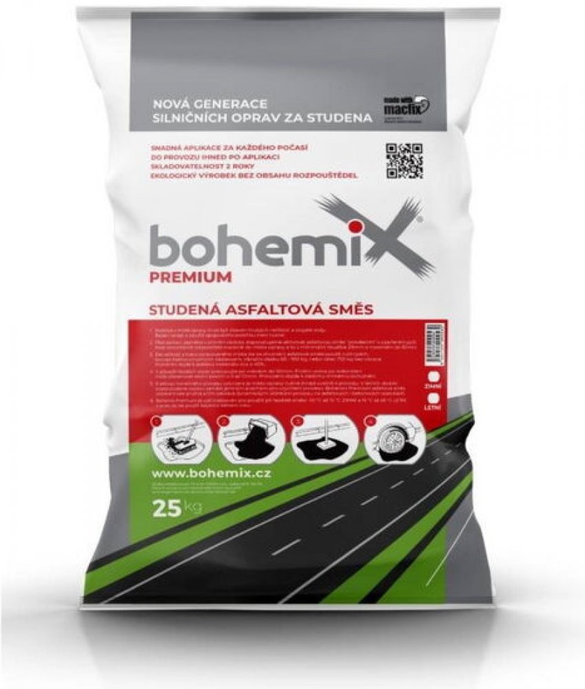 Inteligentní asfaltová směs Bohemix® je skladovatelný vysoce kvalitní produkt, poskytující rychlé řešení pro okamžitou a trvalou opravu výtluků, překopů, vývrtů, širších spár asfaltových nebo betonových povrchů.PoužitíDíky svým jedinečným vlastnostem je ideálním řešením při opravě výtluků, dále pak zapravení povrchu po opravách vodoinstalací, kanalizačních vpustí, po výměně obrubníků apod. VlastnostiVelmi vysoká odolnost proti UV záření, vodě a mrazuAplikovatelný za mrazu, vlhka a přímého slunečního záření (od -10 °C do 45 °C)Lze volně skladovat nejméně 2 rokyJe jednosložkový a určený k okamžitému použitíReaktivuje okolní asfalt a tím vznikne voděodolný spojEkologický bez obsahu rozpouštědelPo vytvrzení je stále elastický - nedochází k vydrolení a degradaciPoužitelný v kombinaci s asfaltem, betonem i kovem (ideální na kanalizační vpustě)VýhodySnadná pokládkaOkamžité použitíVynikající vlastnostiBalení: 25 kg