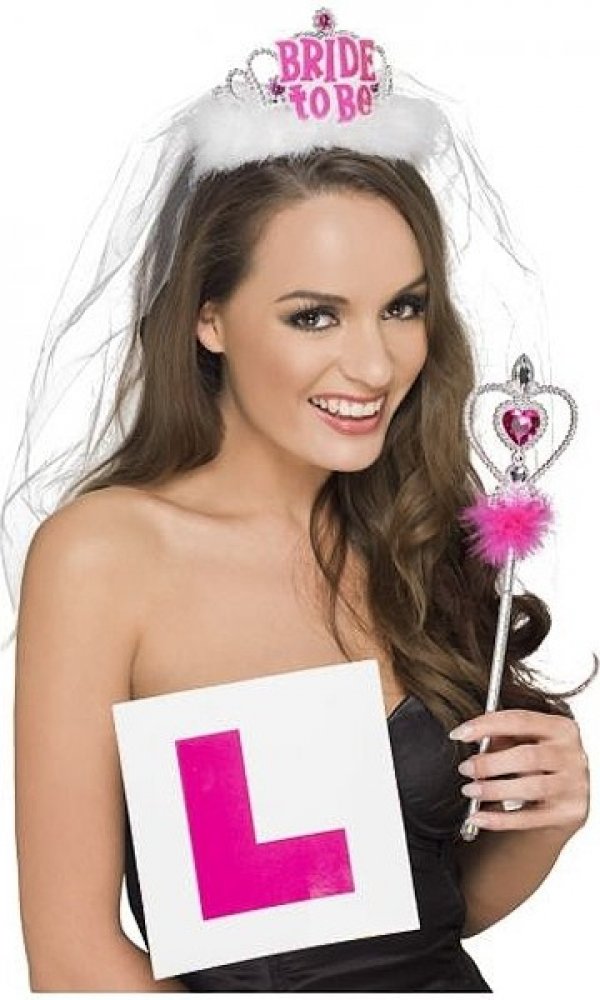 čelenku se závojem "Bride To Be" (budoucí nevěsta)