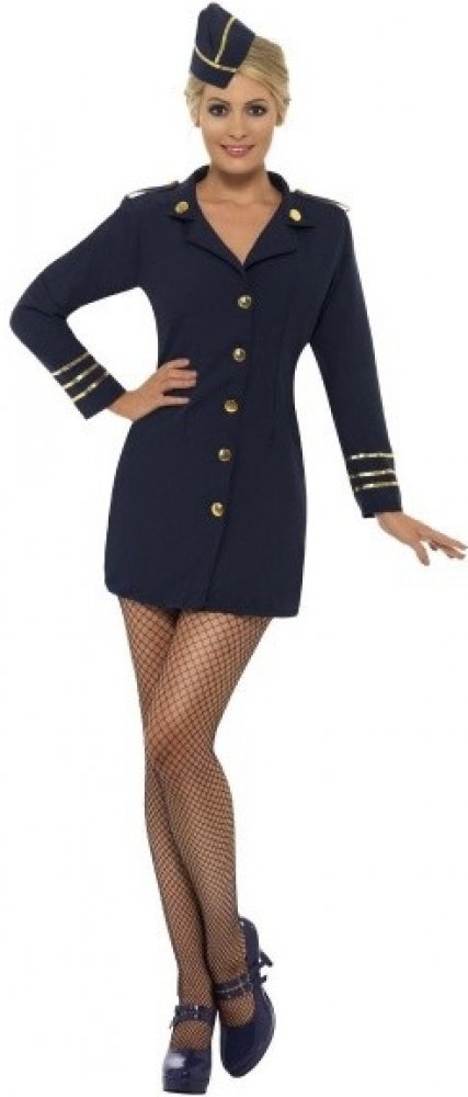 Tento krásný kostým z vás v mžiku udělá profesionální a sexy letušku. Součástí kostýmu Letuška jsou tmavě modré mini šaty s knoflíčky a čepec v barvě námořnické modři se zlatým lemováním. Punčocháče nejsou součástí kostýmu.