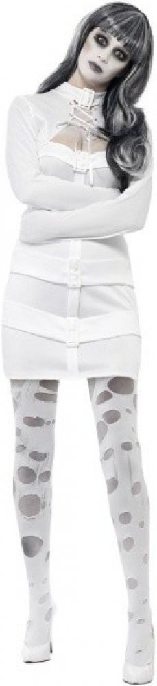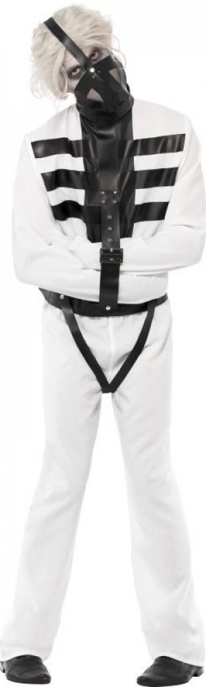 Tento kostým pro dámy se skládá z bílých šatů se speciálními rukávy s napodobeninami přezkových pásů ve znamení, že osoba je ve svěrací kazajce.