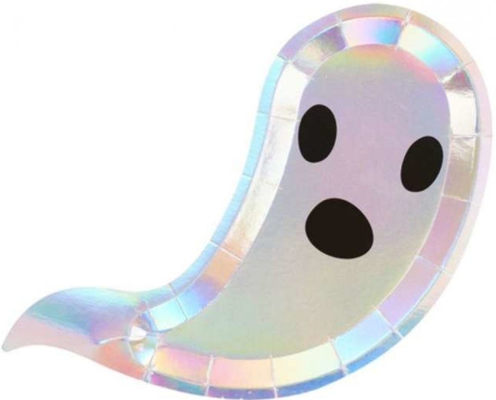 Sada papírových talířků ve tvaru ducha s duhovými odlesky. Jejich velikost je ideální pro podávání porce dortu nebo jiného dezertu. Tyto talíře jsou velmi originální doplněk stolování dekorace na halloweenskou párty. Velikost 14,5 x 149 cm Balení obsahuje 8 ks