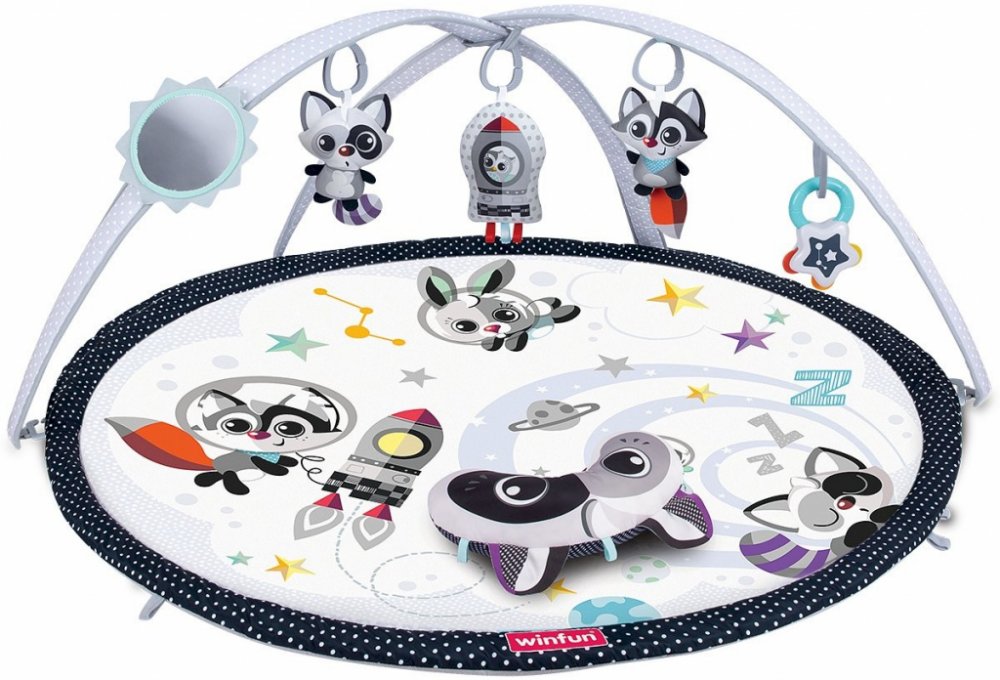 Přizpůsobeno 3 nejdůležitějším fázím vývoje batole: ležící na zádech, ležet na bříšku, sedět a plazit se. Podložka je vyrobena z nejlepších materiálů. Je to měkké a bezpečné místo pro hru pro každé batole. Rozvíjí pohyblivost, povzbuzuje vás ke zvednutí hlavy a převrácení bříška. Rozvíjí kognitivní dovednosti. Hračky mohou být zavěšeny v různých výškách a odnímatelné, takže si je můžete vzít na procházku nebo na výlet autem. Má odnímatelné tyče a snadno se skládá a balí. Lze prát v pračce.